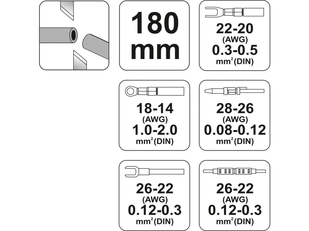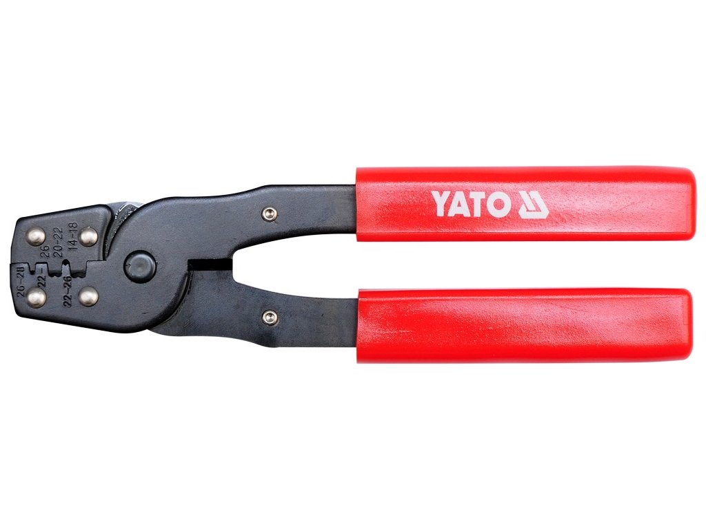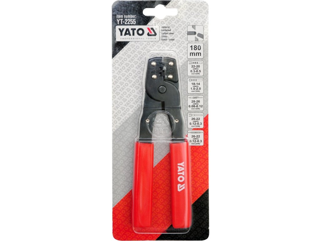 Kleště YT-2255 pro krimpování dvou typů konektorů, se zčernalým povrchem, který chrání před korozí, a s plastovými kryty rukojetí.