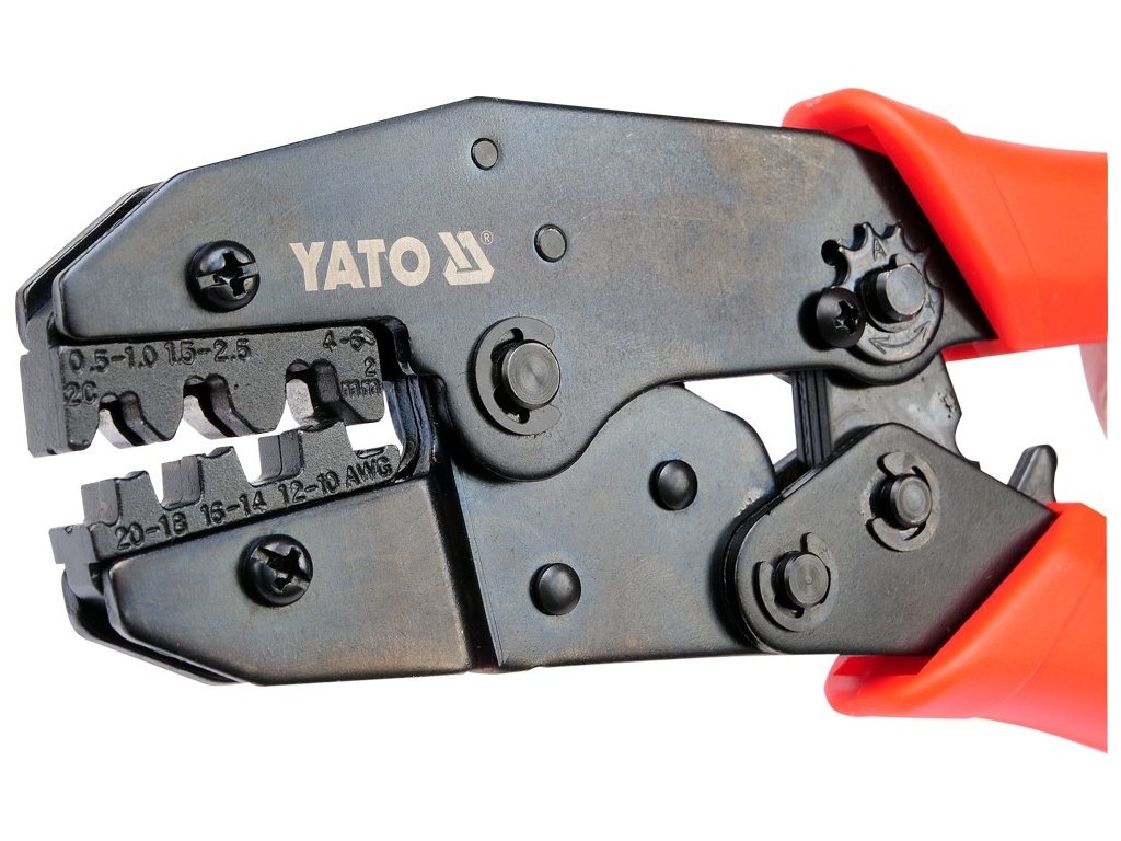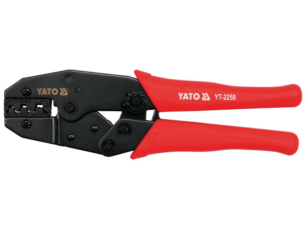 Kleště YT-2250 pro krimpování izolovaných konektorů, se zčernalým povrchem, který chrání před korozí, a s plastovými kryty rukojetí. Rohatkový mechanismus umožňuje rychlé a přesné upnutí bez použití nadměrné síly.