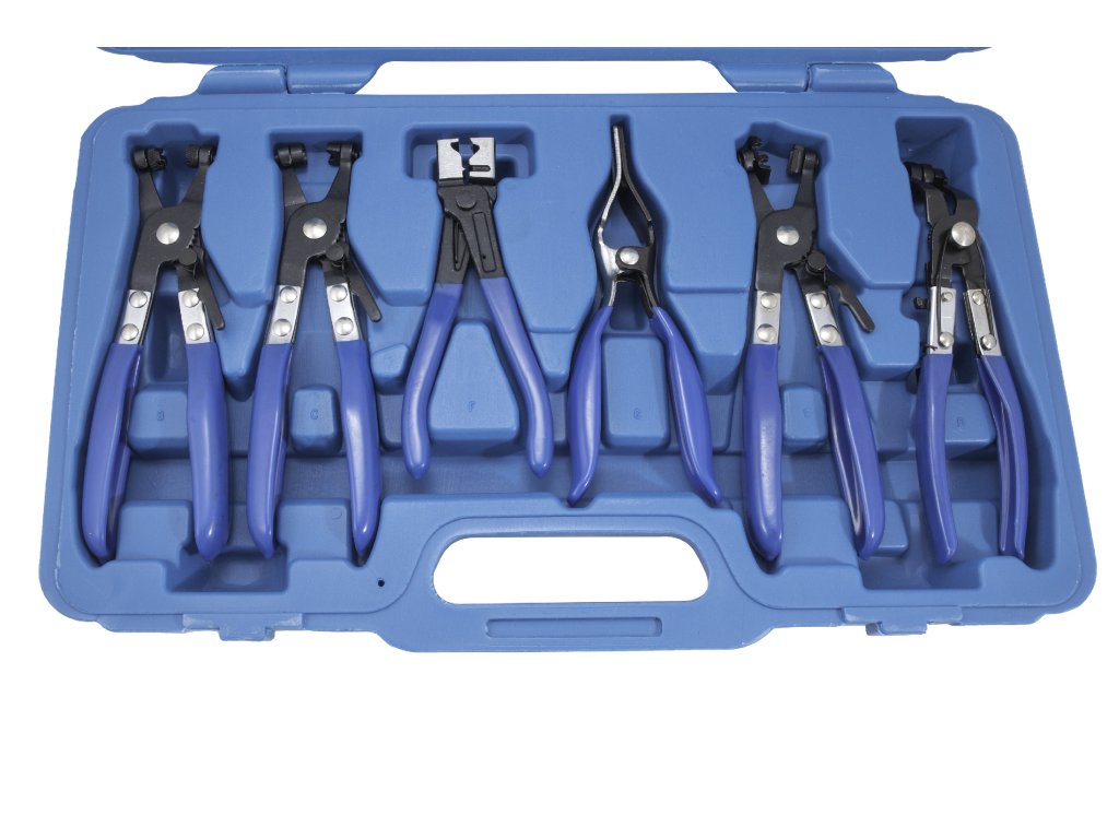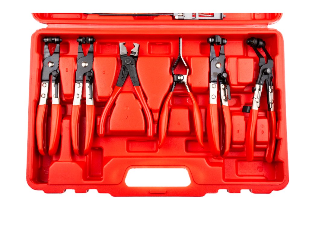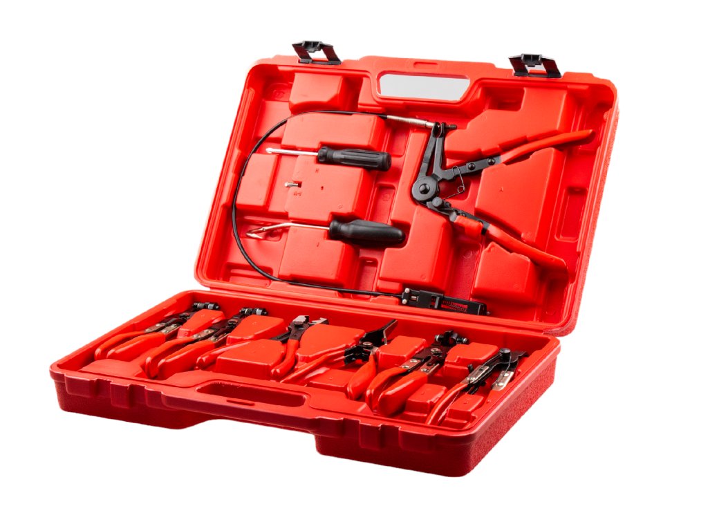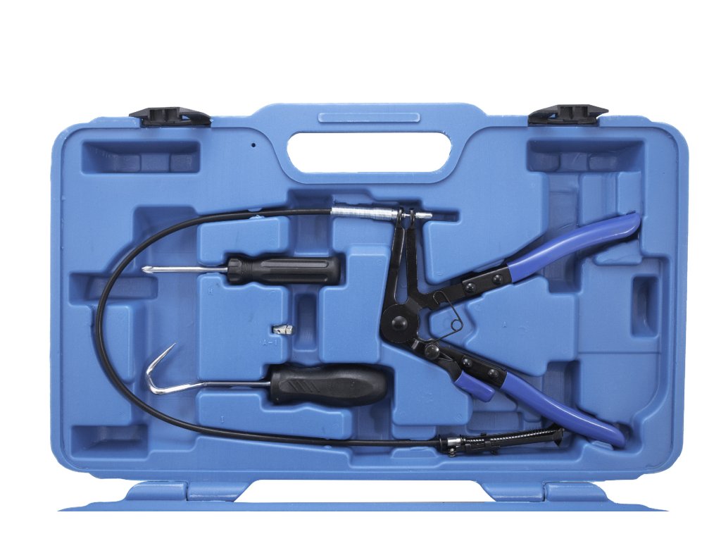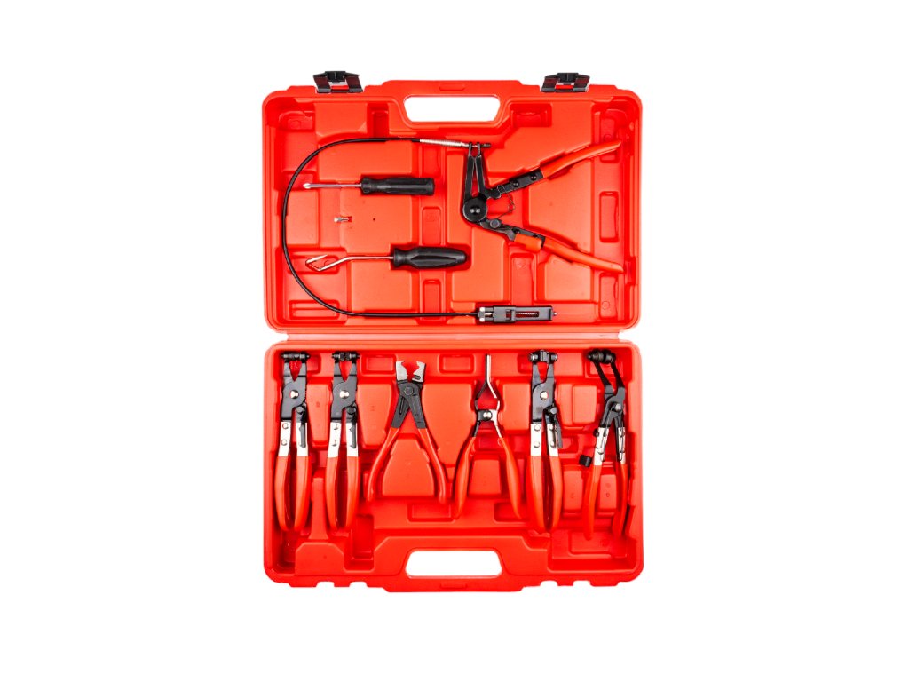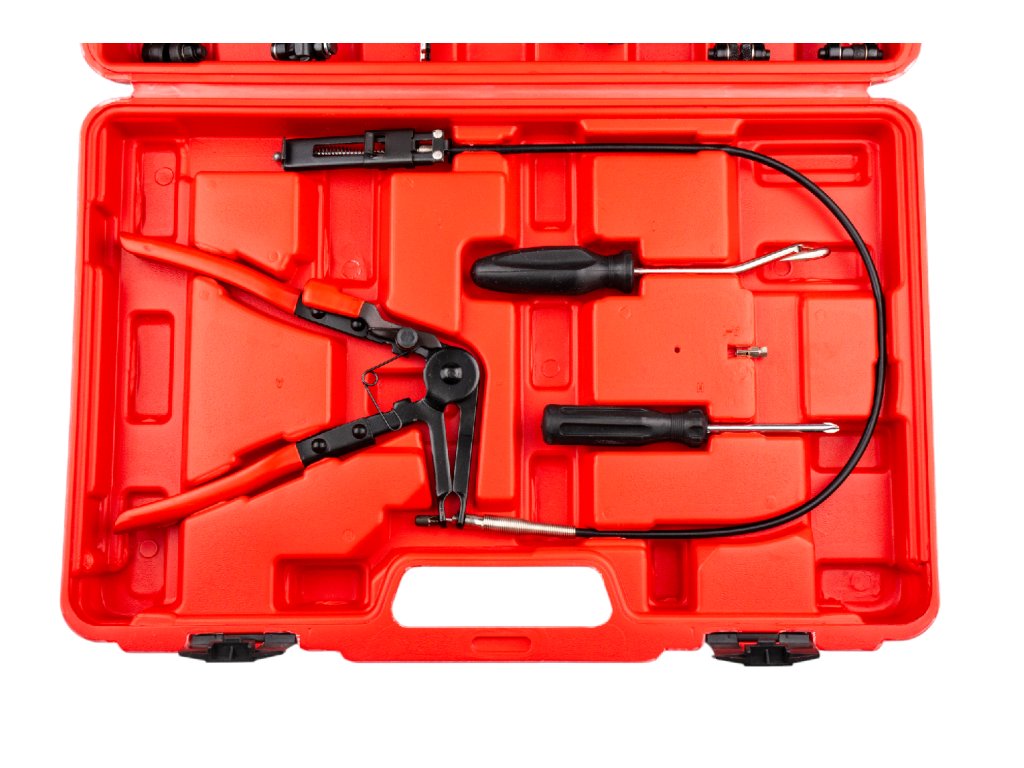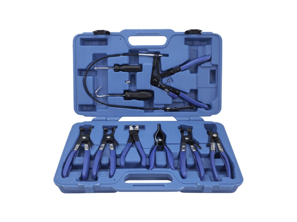 Sada kleští na montáž a demontáž hadicových spon, 9dílná, v kufříku – QUATROS QS20334Komplexní sada kleští na hadicové spony v praktickém plastovém kufříku. Sada obsahuje sedm různých kleští na rozmanité druhy samosvorných hadicových spon (pásků), od velkých širokých spon, přes spony typu Clic a Clic-R, až po tenké drátové spony. Součástí jsou také speciální kleště s čelistmi na 60cm bowdenu (lanku) umožňující demontáž hadic v obzvláště nepřístupných místech. Šetří tak čas, který by bylo nutné strávit demontáží okolních komponent, aby se k hadici dalo dostat s klasickými kleštěmi.