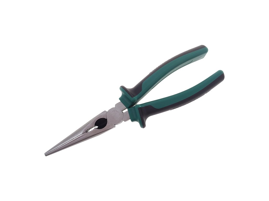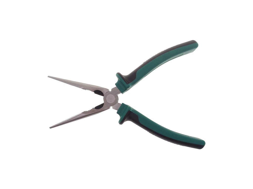 Dlouhé zúžené čelisti umožňují práci v prostorech s omezeným přístupem (např. rozvodné skříně). Jemné vroubkování čelistí pro pevný úchop materiálu; ostří pro podélný střih drátů.