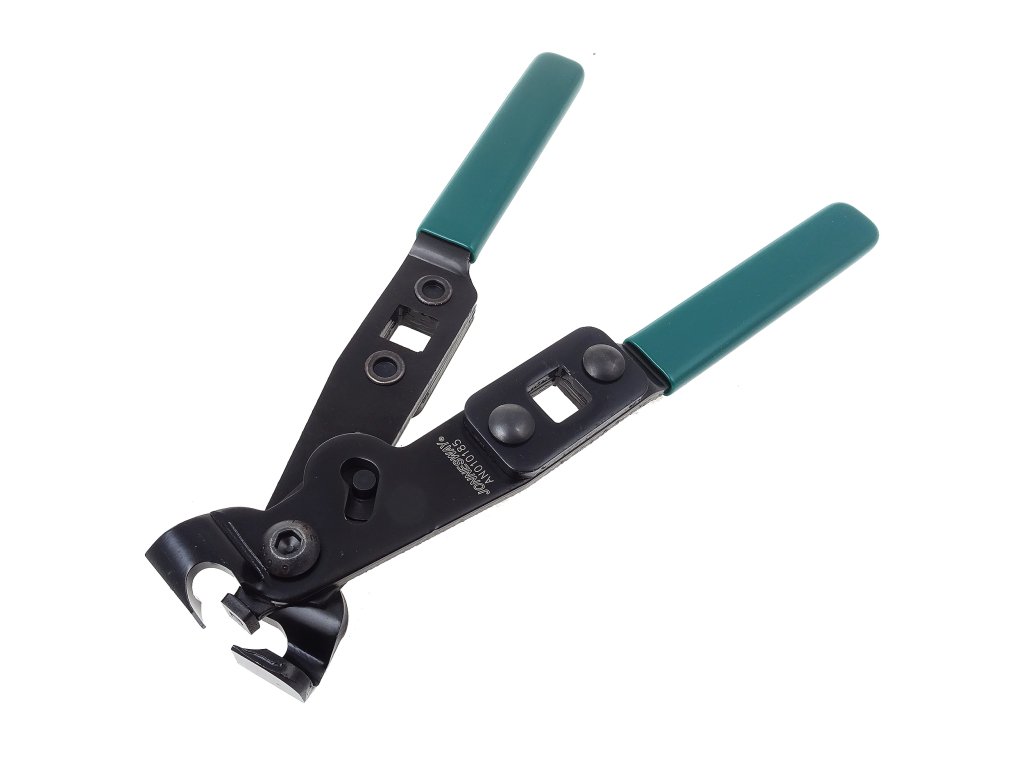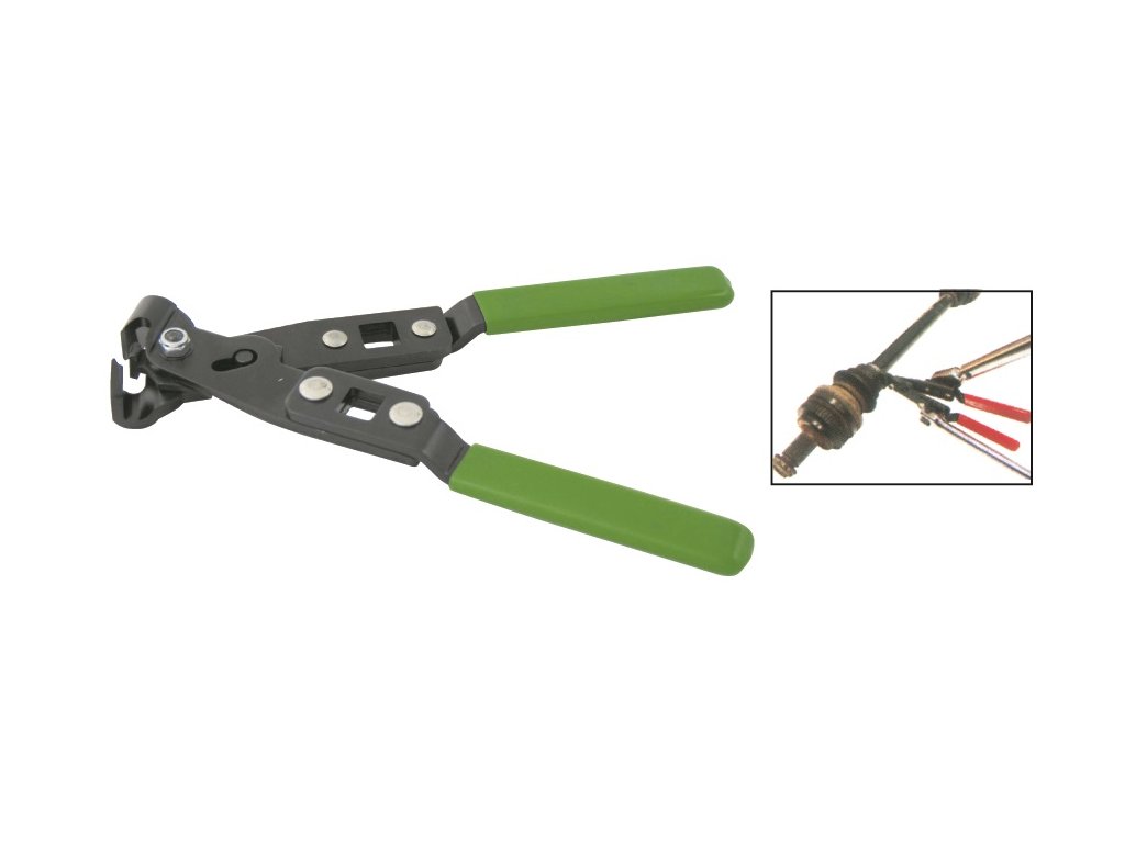 Speciální přípravek na napínání zamačkávacích nerezových pásek (spon) na manžety poloos, homokinetických kloubů, hadic chladícího a palivového systému apod. Na každé rukojeti je upínací otvor pro čtyřhran 1/2“ pro momentový klíč nebo ráčnu (když je výrobcem vyžadováno napnutí pásky specifickým momentem).