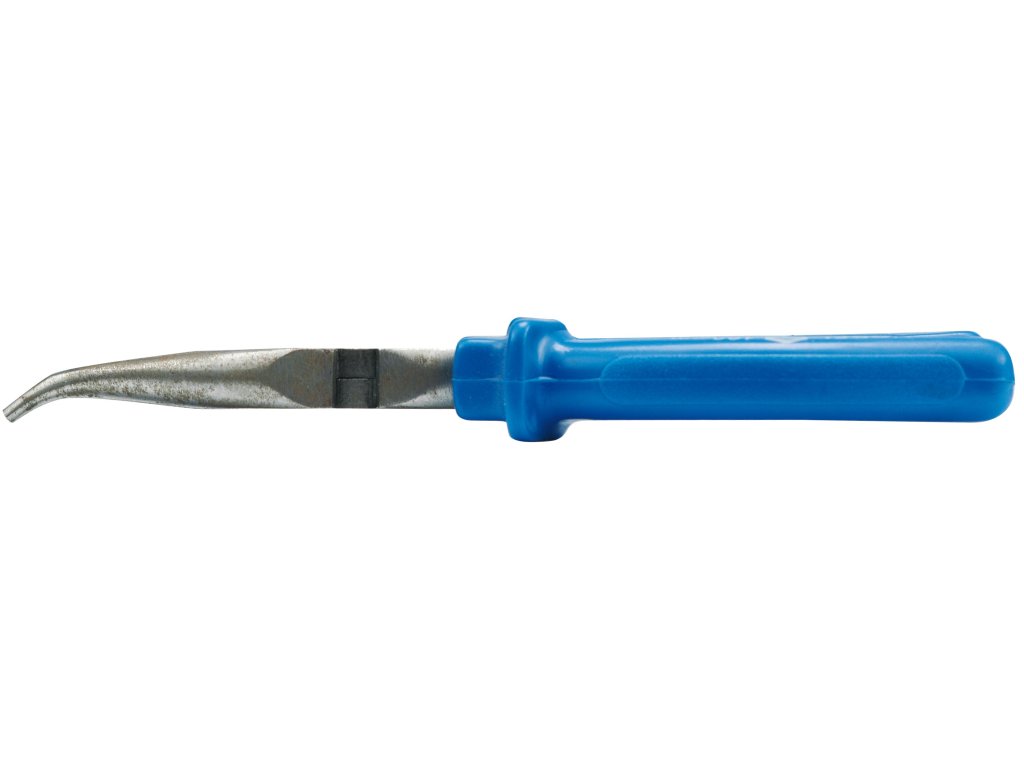 Prodloužené ohnuté kleště 160 mm. Povrch zoubkovaných čelistí s profilovanými břity pro střihání drátu a hřebíků. Rukojeti potažené pohodlnými plastovými kryty.