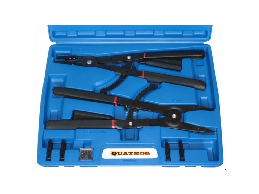 Souprava kleští na segrovky s výměnnými koncovkami Quatros QS50868 Komplexní sada kleští na kroužky seger. Souprava obsahuje: Kleště na seger, délka 400 mm – vnější Kleště na seger, délka 400 mm – vnitřní Výměnné koncovky: - Rovné vnější - Rovné vnitřní - Zahnuté 45° vnitřní - Zahnuté 45° vnější - Zahnuté 90° vnitřní - Zahnuté 90° vnější Baleno v praktickém plastovém kufříku.Doplňkové parametry