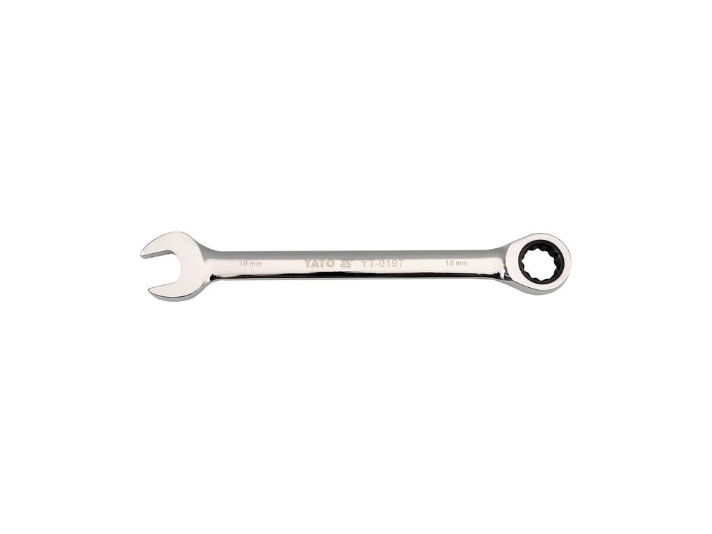 Ráčnový očkoplochý klíč Yato - na jedné straně klasický stranový klíč, na straně druhé očkový klíč s dvanáctihranným profilem vybaveným ráčnou s jemným dělením 72 zubů. Tělo klíče je vyrobeno z chromvanadiové oceli CrV6140. Povrch je vyleštěn do vysokého lesku.