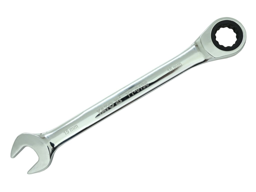 Ráčnový očkoplochý klíč Yato - na jedné straně klasický stranový klíč, na straně druhé očkový klíč s dvanáctihranným profilem vybaveným ráčnou s jemným dělením 72 zubů. Tělo klíče je vyrobeno z chromvanadiové oceli CrV6140. Povrch je vyleštěn do vysokého lesku.