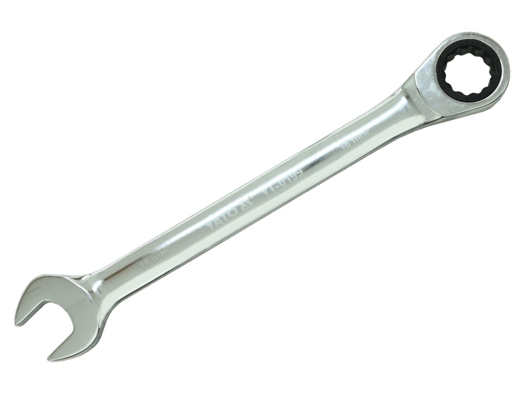 Ráčnový očkoplochý klíč Yato - na jedné straně klasický stranový klíč, na straně druhé očkový klíč s dvanáctihranným profilem vybaveným ráčnou s jemným dělením 72 zubů. Tělo klíče je vyrobeno z chromvanadiové oceli CrV6140. Povrch je vyleštěn do vysokého lesku.