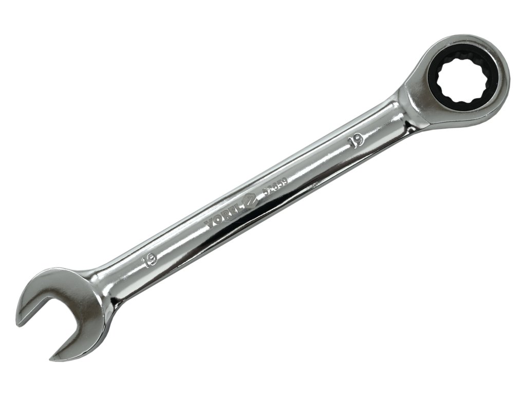 Ráčnový očkoplochý klíč o velikosti 19 mm.