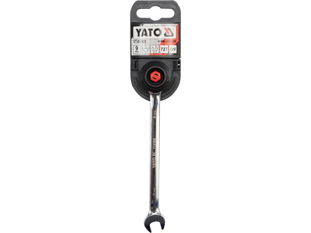 Ráčnový očkoplochý klíč Yato - na jedné straně klasický stranový klíč, na straně druhé očkový klíč s dvanáctihranným profilem vybaveným ráčnou s jemným dělením 72 zubů. Tělo klíče je vyrobeno z chromvanadiové oceli CrV6140. Povrch je vyleštěn do vysokého lesku.