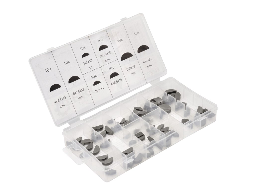 Polokruhové klíny – kruhová Woodruffova pera, různé rozměry, sada 80 ks v plastové krabičce – GEKO G02918
