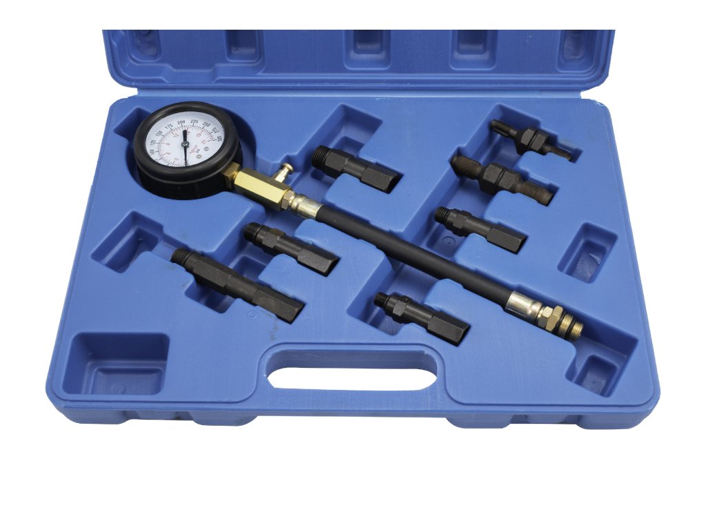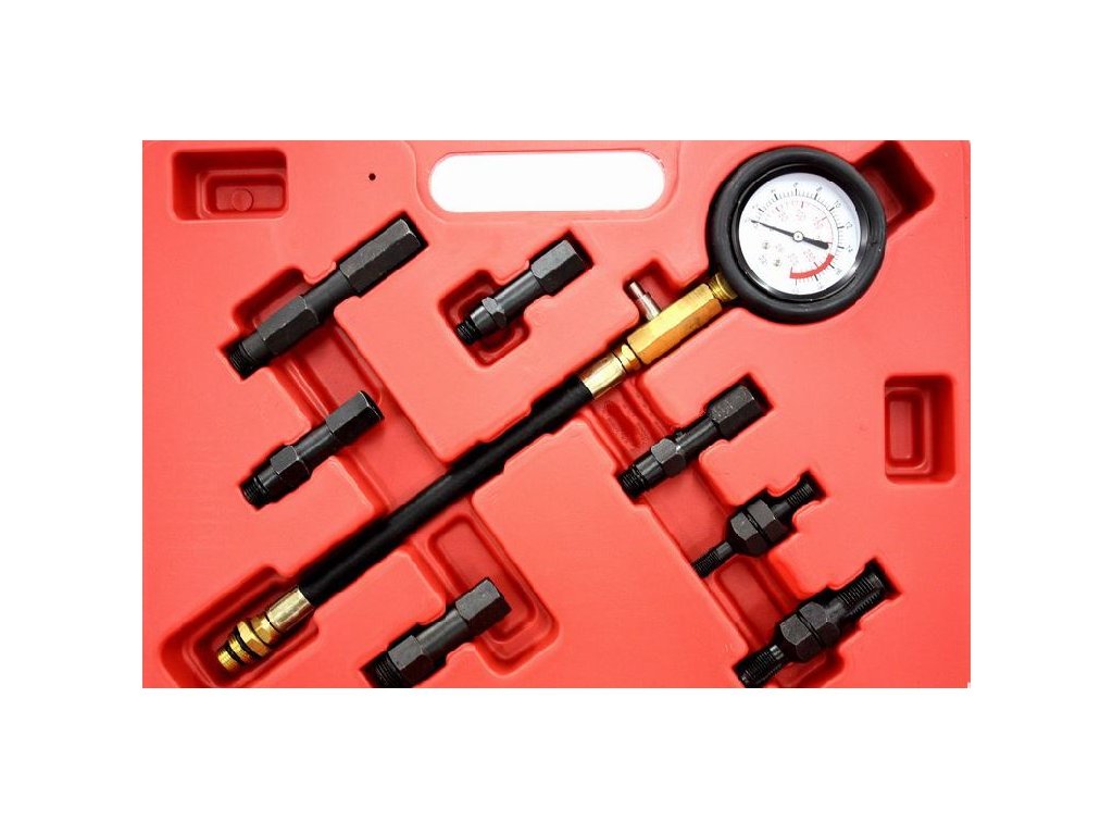 Přesný přístroj pro měření kompresního tlaku ve válcích zážehových motorů osobních a lehkých užitkových automobilů přes otvory pro zapalovací svíčky je začleněn do sady v plastovém kufříku, která obsahuje tlakoměr 0-20 bar (0-300 PSI) s vysokotlakou flexibilní hadicí (délka 20 cm) zakončenou 14mm a 18mm redukčním adaptérem.