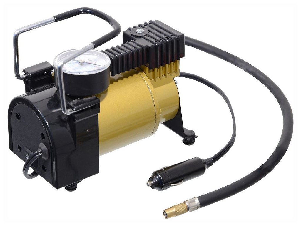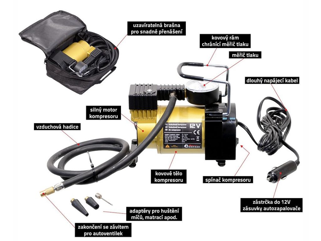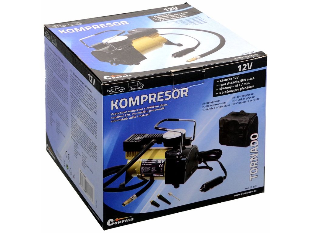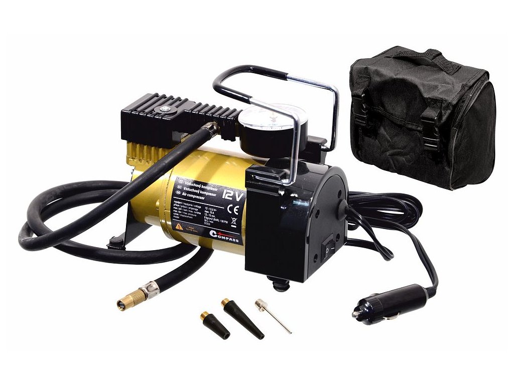 Vzduchový kompresor s měřičem tlaku, napájení 12V=. Napájecí kabel se zástrčkou do zásuvky automobilového zapalovače 12V. Kompresor je vhodný k huštění pneumatik osobních automobilů, dodávek i vozů 4x4. Kompresor vyvine max. tlak 9 kg/cm2 (BAR).