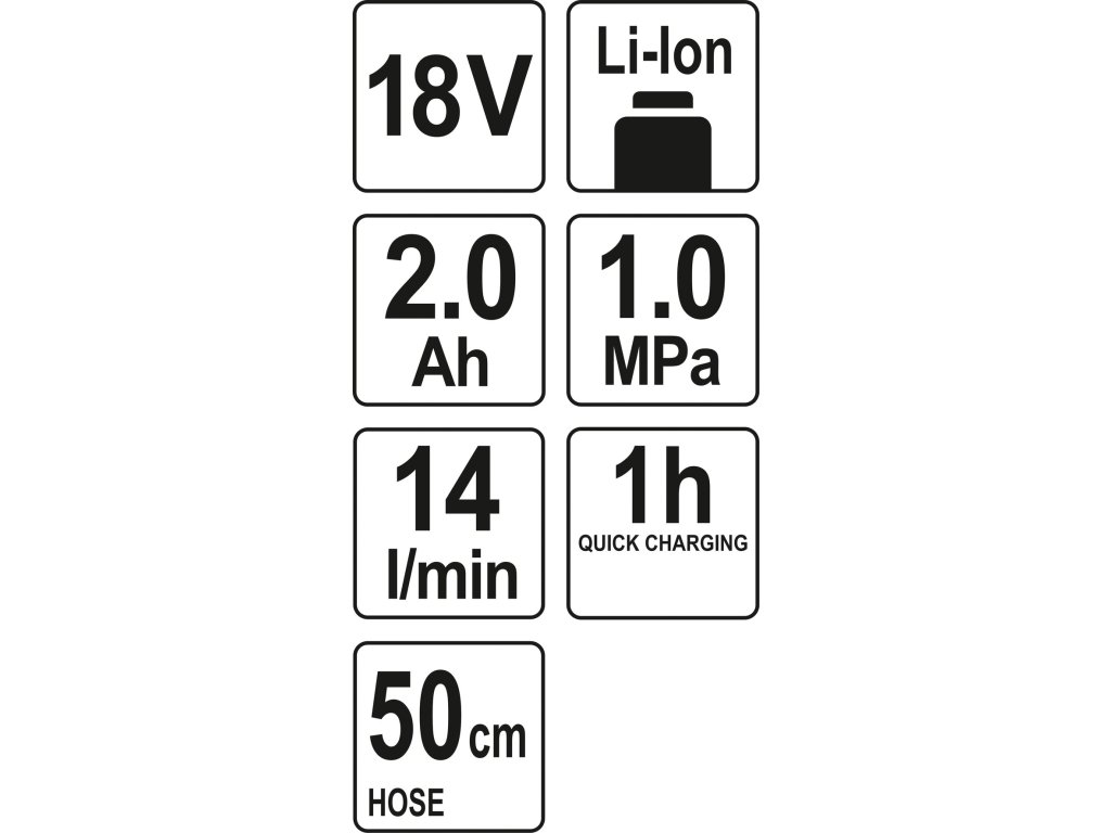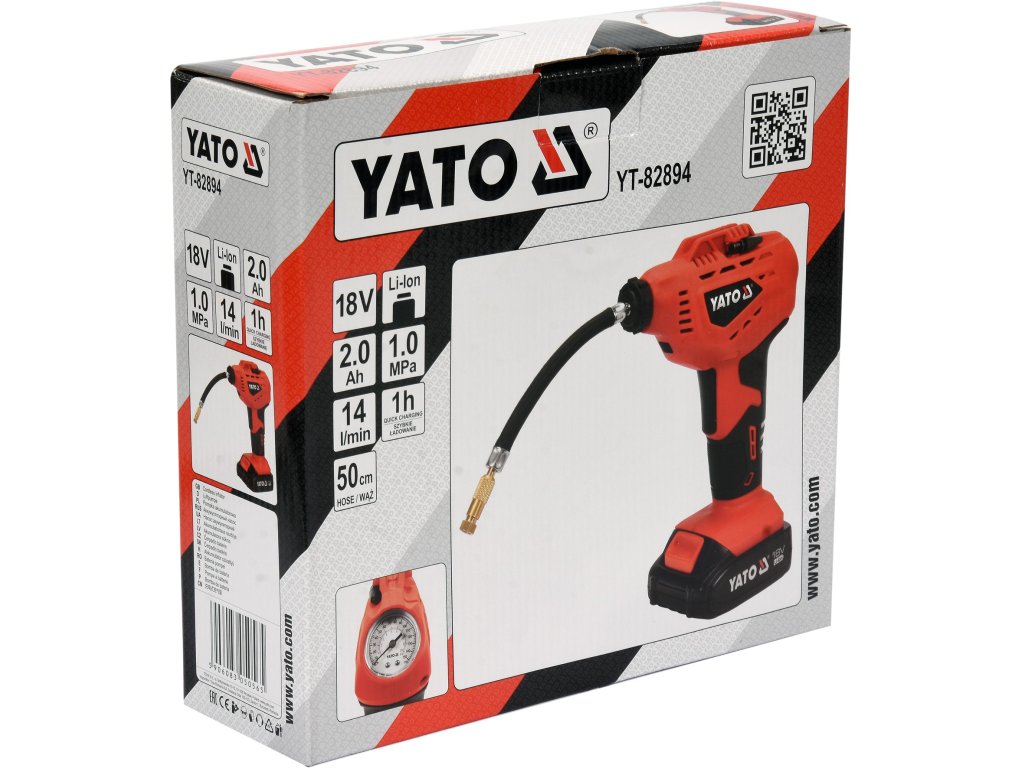 Zařízení nahrazuje kompresor všude tam, kam se běžný kompresor nedostane. Zadní strana zařízení je opatřena manometrem. Vzduchová hadice má délku 50 cm. Sada obsahuje i nabíječku kompatibilní se všemi bateriemi Yato.