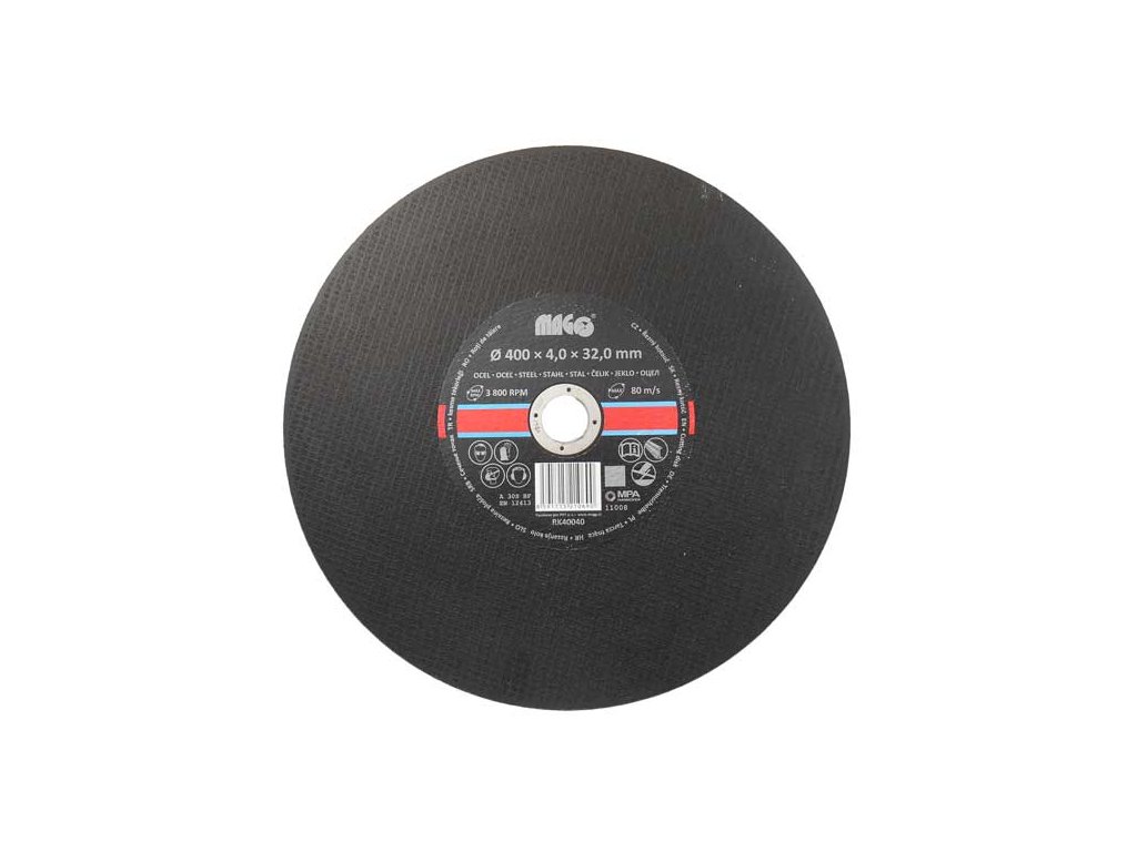 Řezný kotouč na kov – ocel MAGG RK40040 Průměr: 400 mm Tloušťka: 4,0 mm Průměr upínacího středového otvoru: 32,0 mm Max. otáčky: 3800 ot. / min. Standardní kotouč s velkým průměrem na řezání kovu.Doplňkové parametry