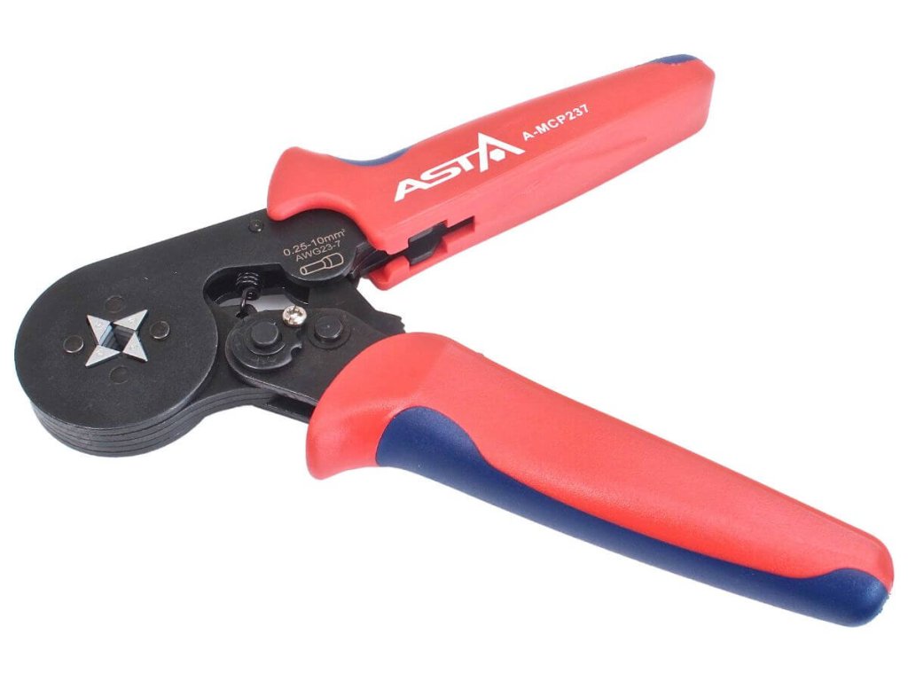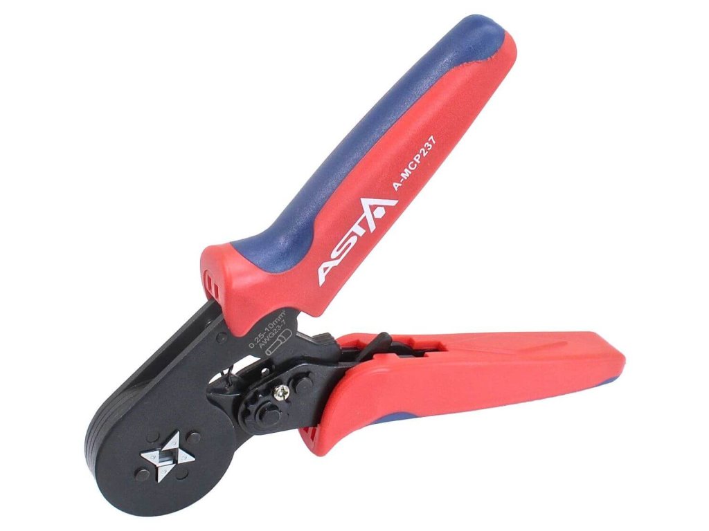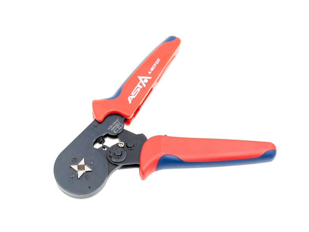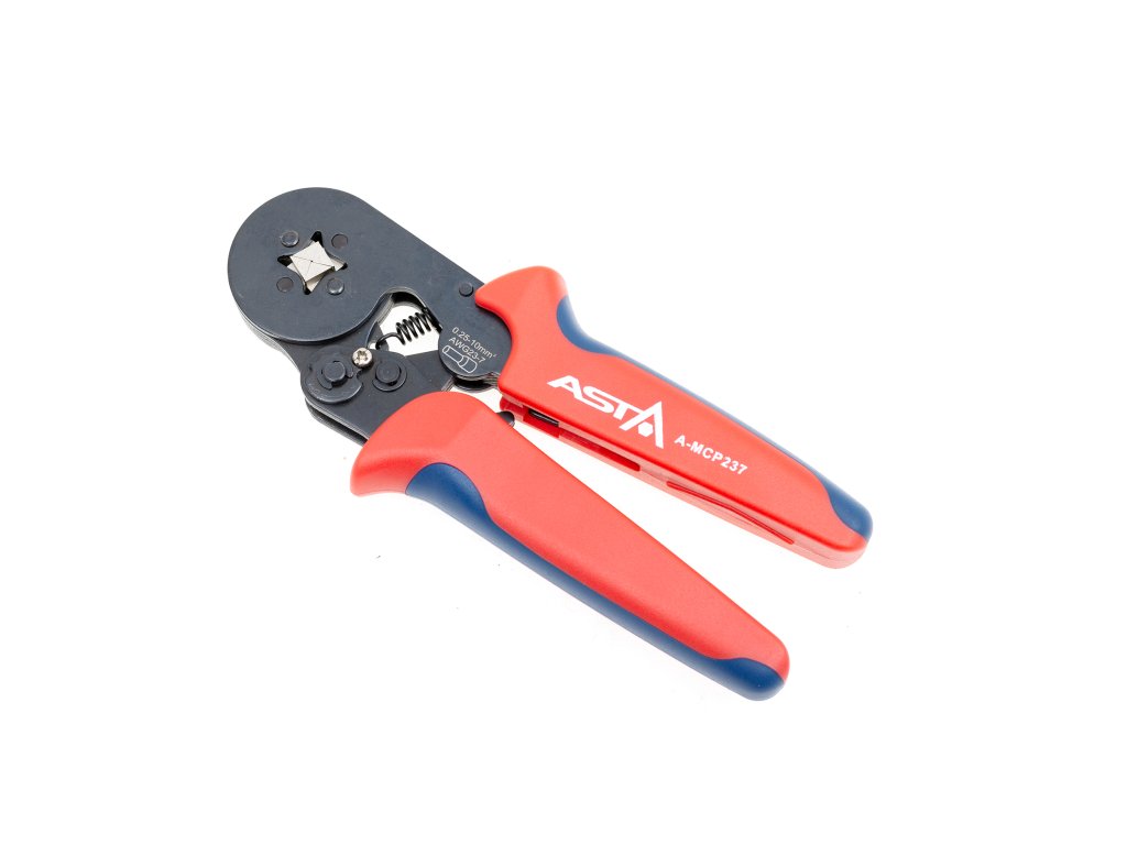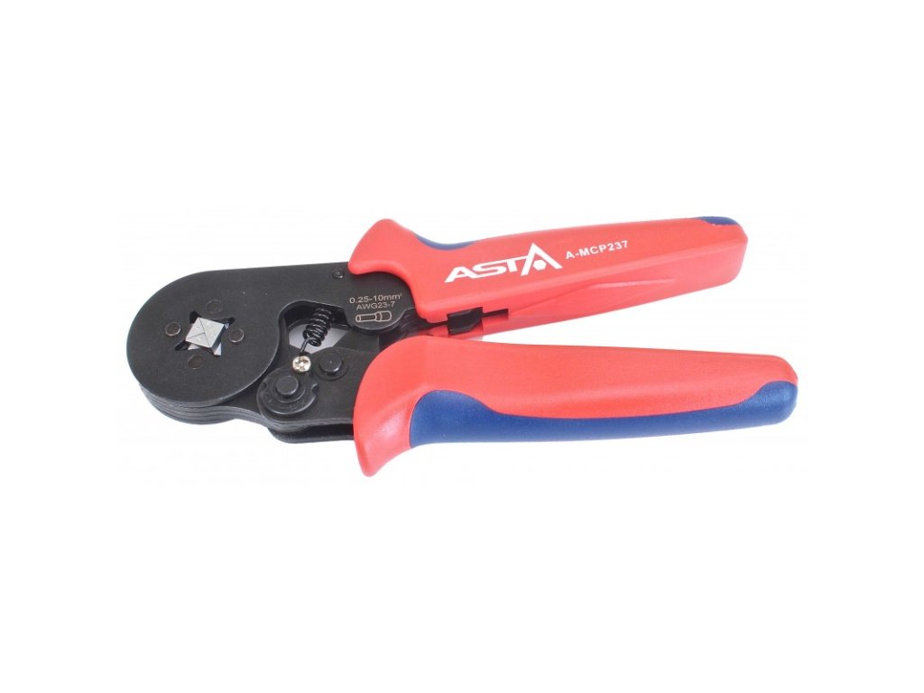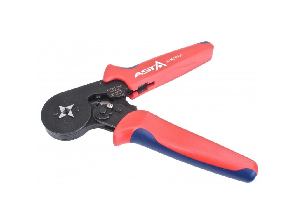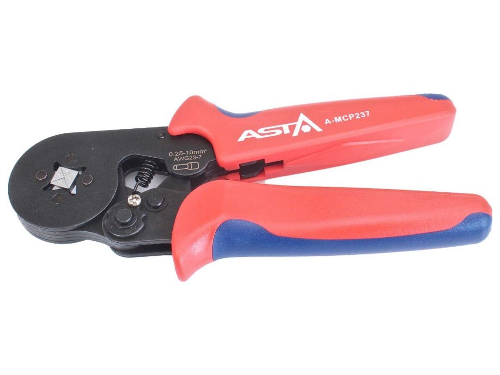 Elektrikářské kleště na krimpování – lisování elektrických dutinových konektorů (dutinek), tzv. „krimpovačky", čtyřhranné čelisti, se samo nastavovacím systémem – ASTA A-MCP237.