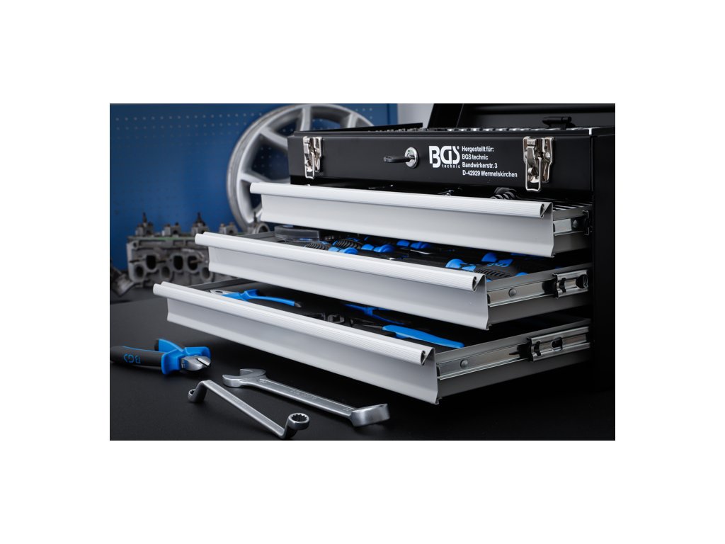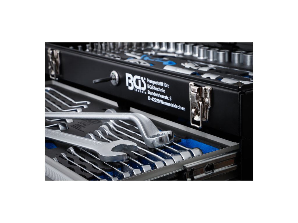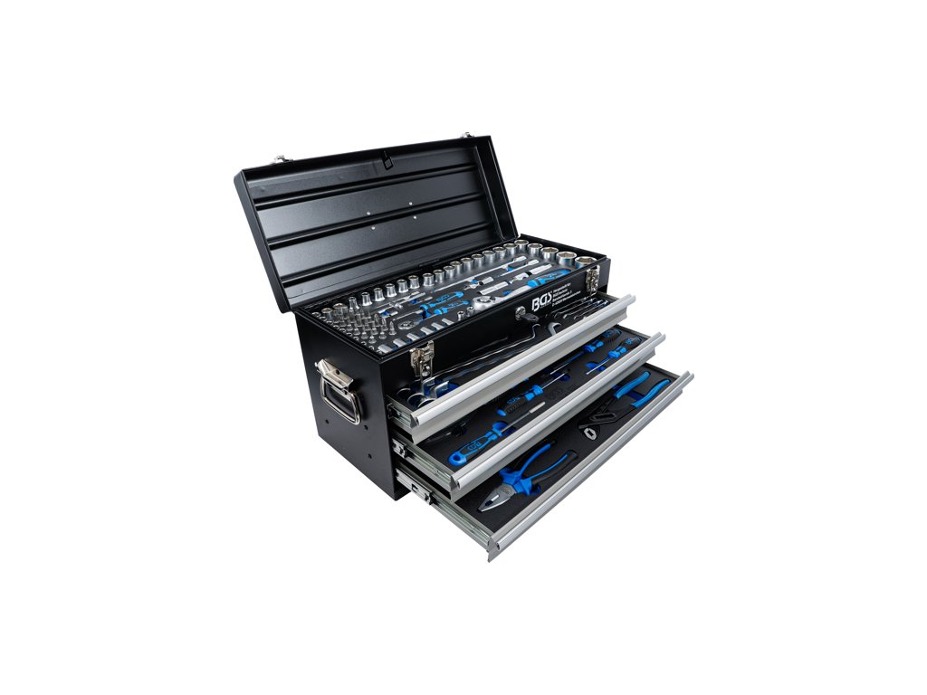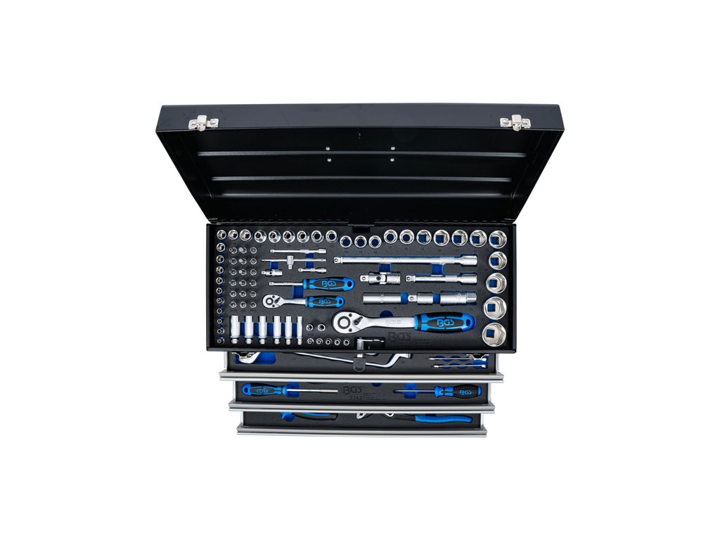 Velká sada ručního nářadí: gola sady 1/4“ a 1/2“, kleště, klíče, šroubováky a bity, 143 dílů v bytelném kovovém kufru (base)– BGS technic 3318