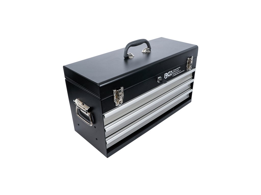 Nářadí je logicky rozčleněno a uloženo ve 3 bočních zásuvkách a vrchním úložném prostoru pod odklápěcím víkem. Uvnitř jsou pěnové vložky, v nichž má každý kus vybavení své přesné místo. Víko je zajištěno 2 kovovými přezkami (zámky).