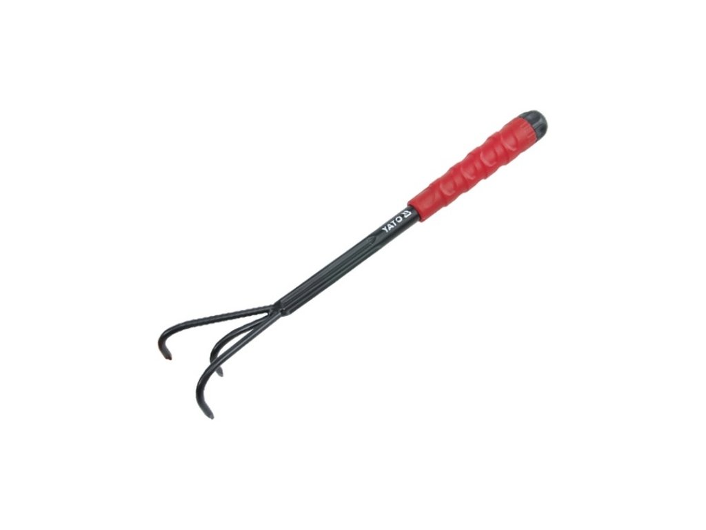 Kultivátor Yato je třízubý, tvarovaný pro bezproblémovou a rozličnou práci na zahradě a je opatřen násadou délky 420 mm.