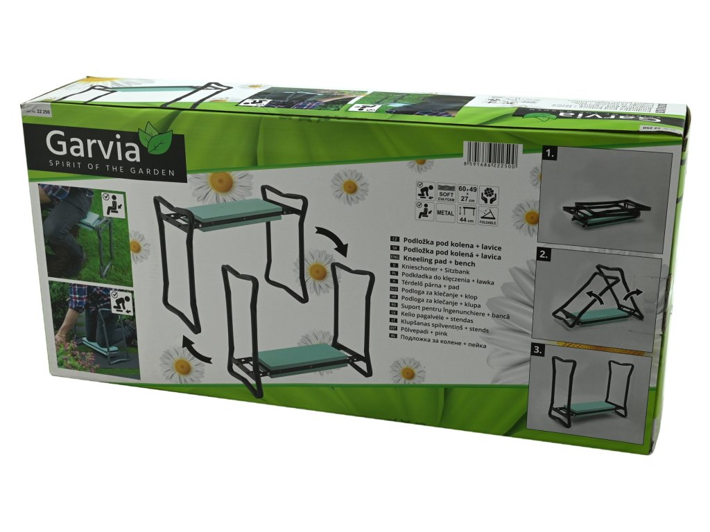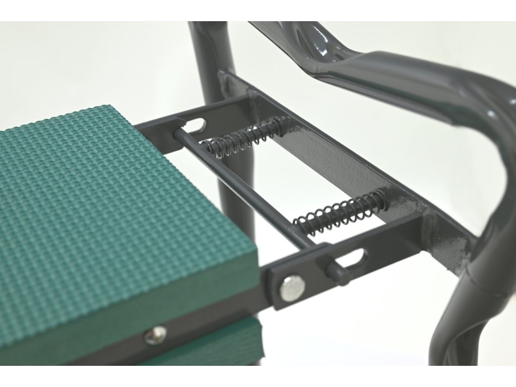 Lavice má celkové rozměry 60 x 49 x 27 cm a je vybavena pevnou kovovou konstrukcí, která zajišťuje stabilitu a vysokou odolnost. Měkká EVA pěnová podložka poskytuje komfortní sezení s posedem ve výšce 44 cm. V případně klečení chrání kolena před tvrdým a studeným povrchem. Ergonomicky tvarované boční rukojeti mohou sloužit jako opora pro vstávání.