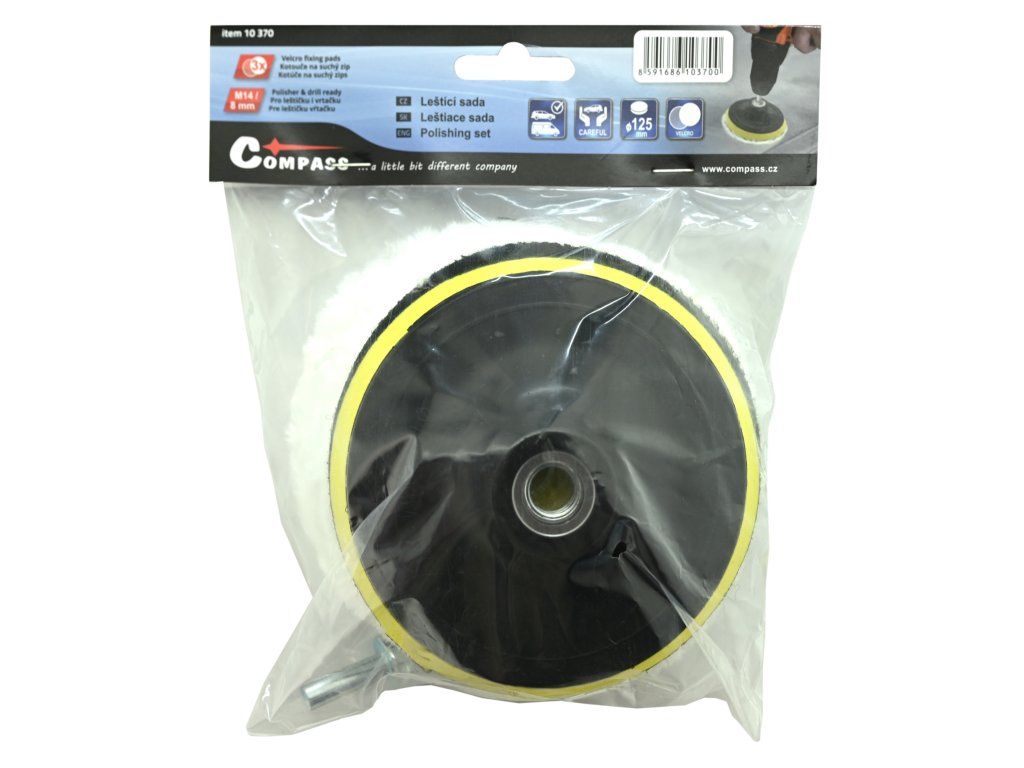 Kotouče i disk mají šíři 125 mm. Unašecí disk je pak opatřen závitem M14 pro upevnění do běžné leštičky, případně lze pomocí adaptéru se stopkou 8 mm uchytit do vrtačky. Kotouče lze snadno přichytit na unašecí disk pomocí suchého zipu.