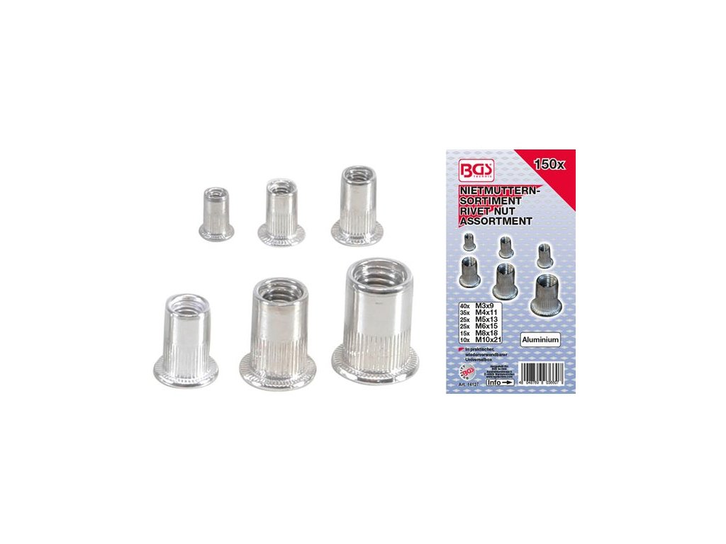 Sada maticových nýtů, tzv. nýtovacích matic, rozměry M3-M10, 150 kusů v plastové krabičce – BGS technic 14127