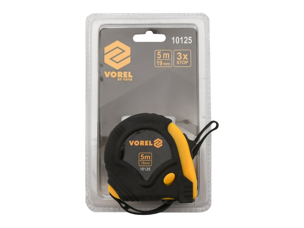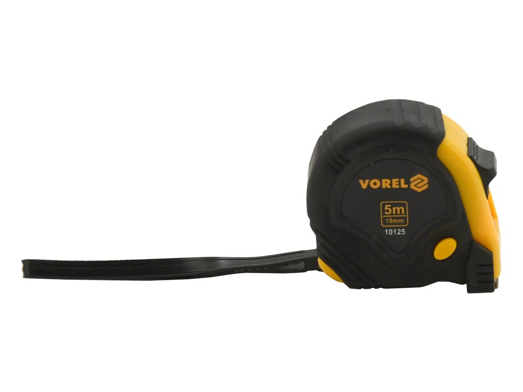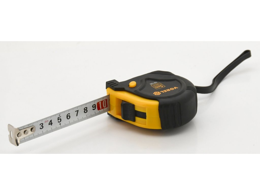 Svinovací metr 5 m dlouhý a 16 mm široký zakončený pohyblivým háčkem. Pouzdro je vyrobeno z plastu, vyztuženo gumovými podložkami a aretačním knoflíkem.