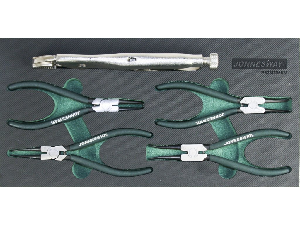 Pěnový modul EVA, vel. „B“ (190 x 380 mm): Sada kleští na pojistné kroužky, tzv. segrovky, a samosvorných kleští (5 ks) – JONNESWAY P32M105KV