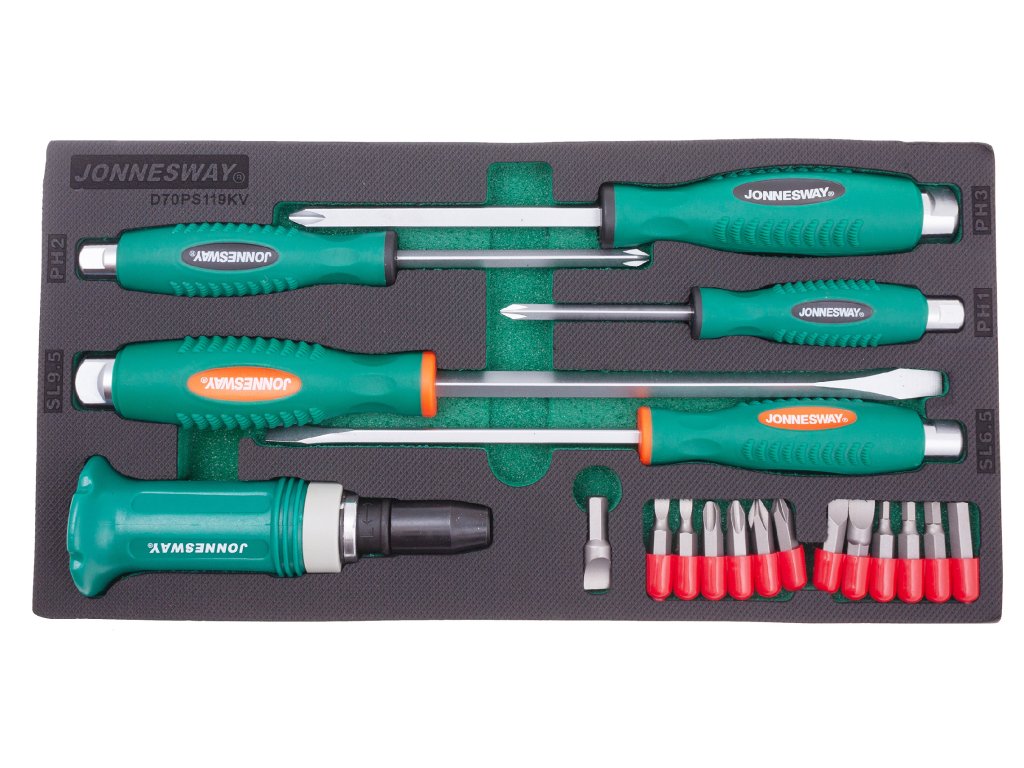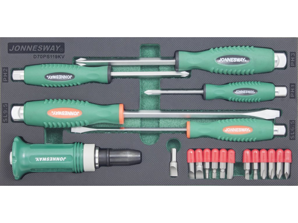 Modul pěnový - úderové šroubováky ploché a křížové, s bity, 19 dílů - JONNESWAY D70PS119KV