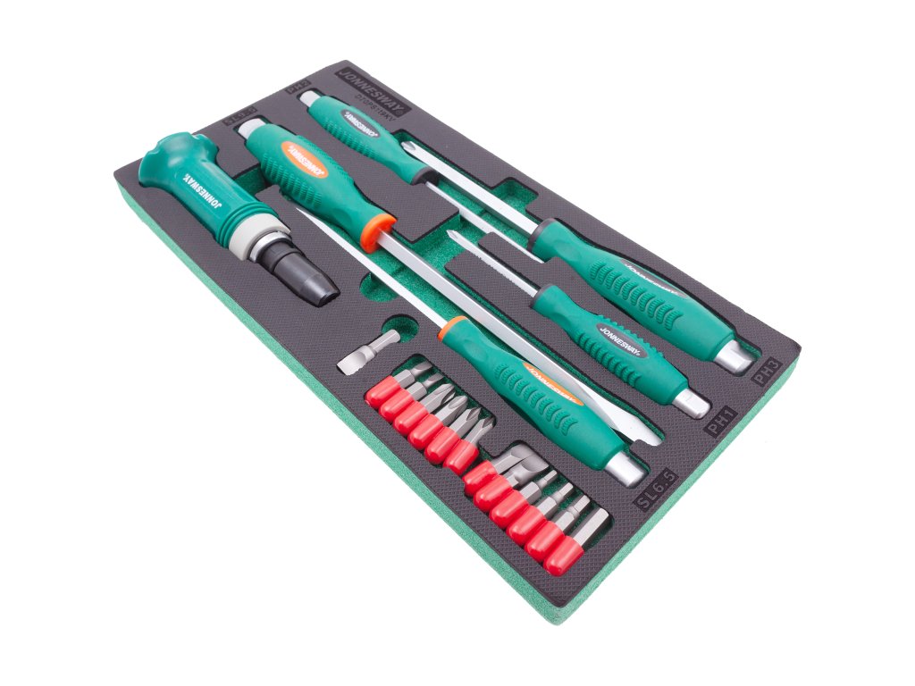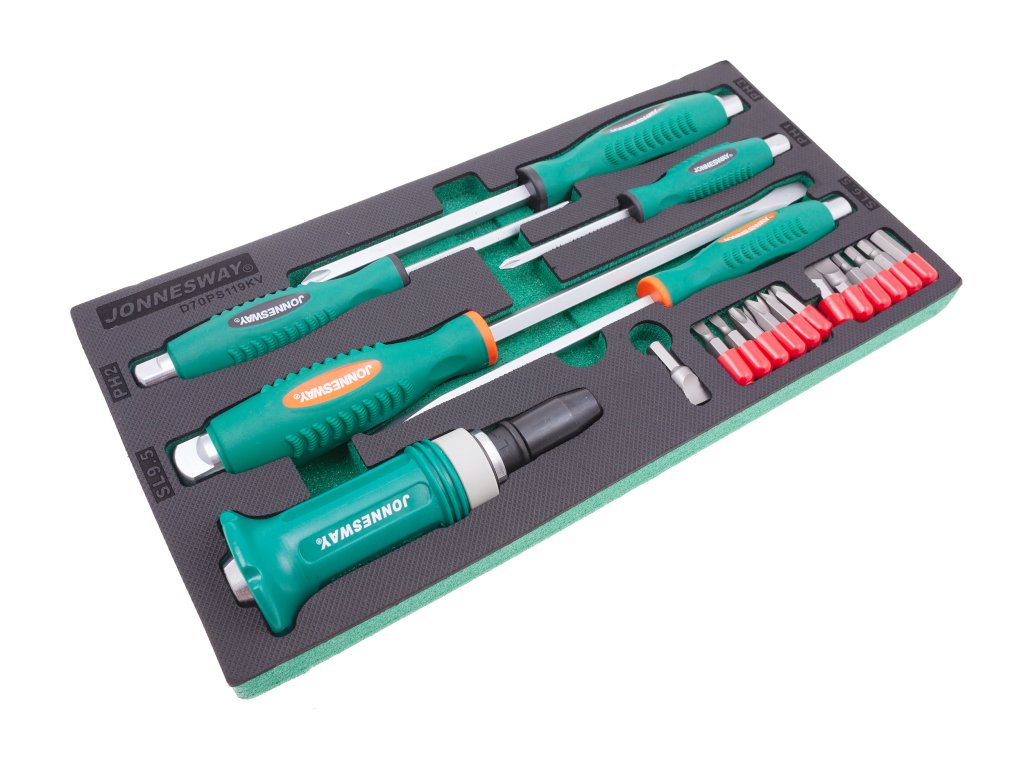 Pěnový modul EVA, vel. „B“ (190 x 380 mm): Souprava klasických úderových šroubováků a rázového šroubováku s bity v pěnovém modulu EVA – JONNESWAY D70PS119KV