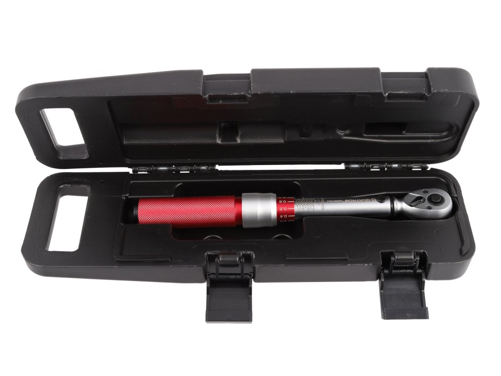 Momentový klíč tzv. „momenťák“ s rozsahem 2-15 Nm, vodící čtyřhran 1/4”, vysoce přesný, přepínání vlevo-vpravo, s kalibračním certifikátem v češtině, pro utahování pravotočivých šroubů, v plastové kazetě – QUATROS QS59015A.