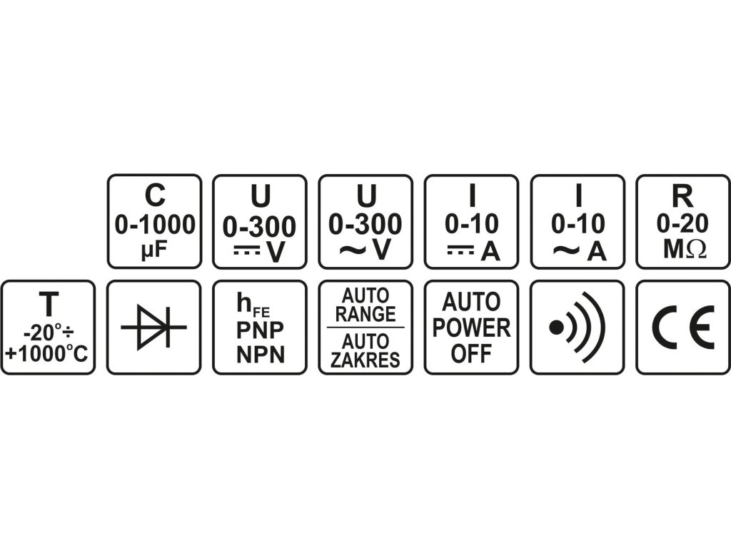 Tento měřák umožňuje měření střídavého a stejnosměrného napětí, proudu i odporu, kapacity a teploty. Navíc je tento multimetr vybaven testovacím slotem pro kontrolu tranzistorů a zároveň umí testovat i diody. Mezi jednotlivými typy měření se přepíná pomocí otočného voliče, kde lze rovněž nastavit požadovaný rozsah u jednotlivých veličin.