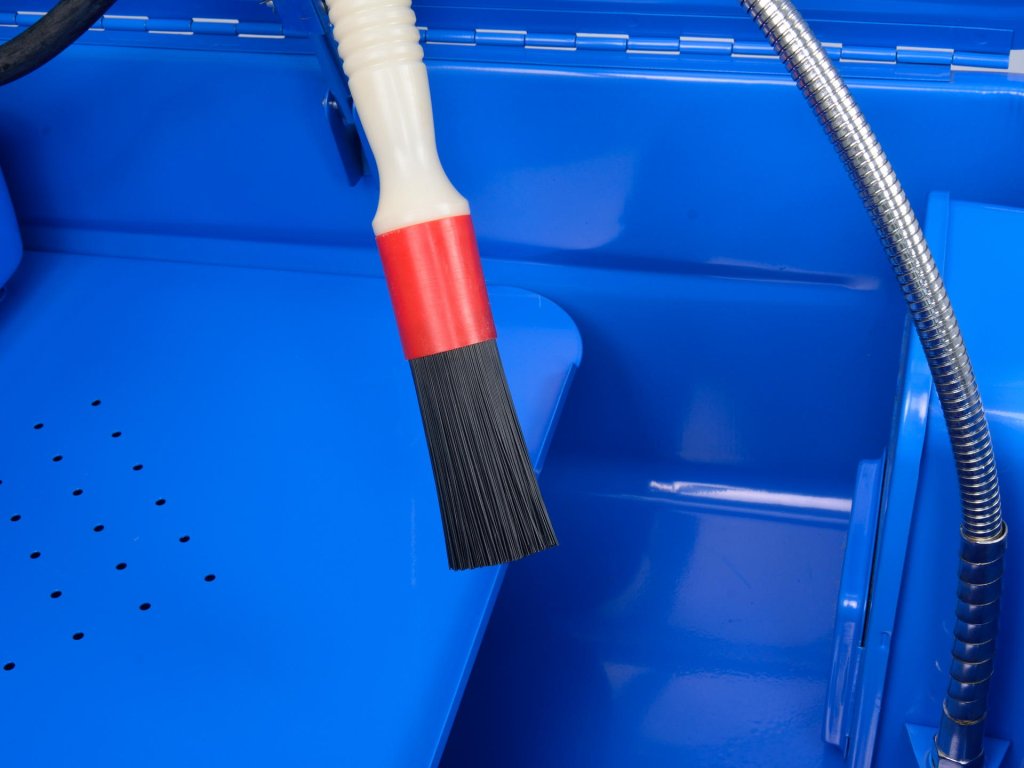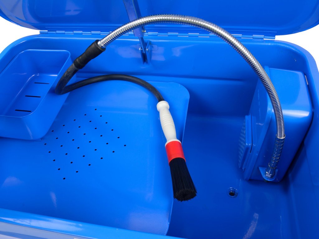 Mycí stůl pracuje s uzavřeným okruhem, tekutina se shromáždí čerpadlem ze dna nádoby a přivádí se do štětce. Ten díky stálému proudu čisticího roztoku a pevným štětinám odstraňuje i odolné znečištění.