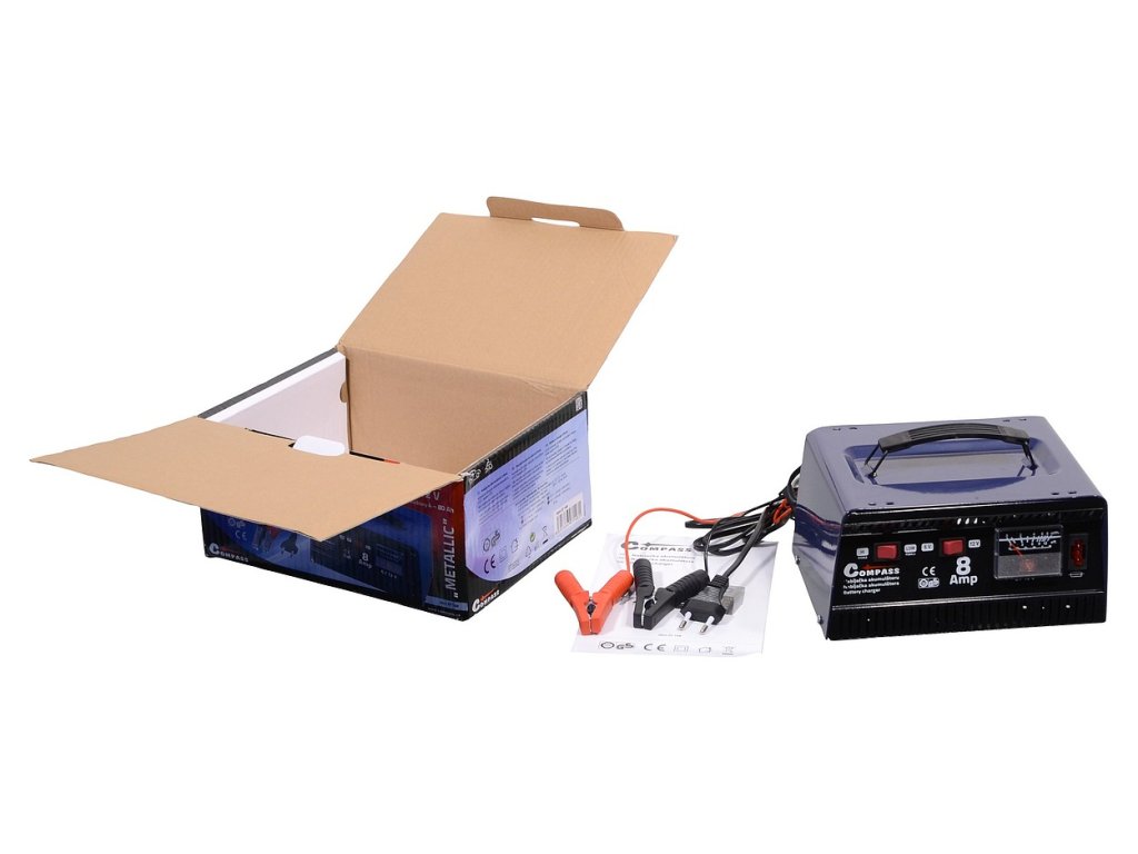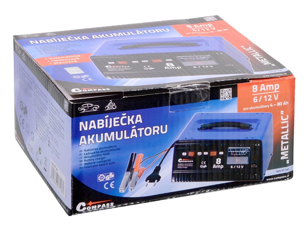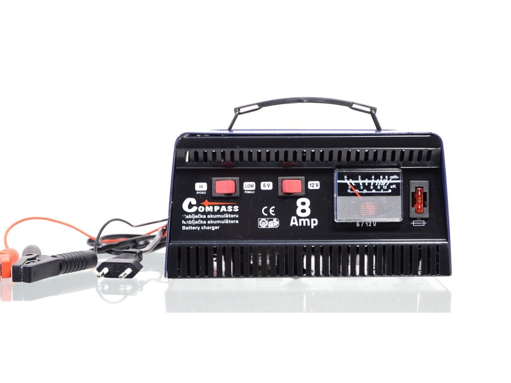 Celokovová automatická nabíječka akumulátorů 6V nebo 12V 8 Amp. Napájení 230V, příkon 84W. Tato nabíječka je určená k nabíjení bezúdržbových olověných akumulátorů o kapacitě 3,7 - 80 Ah. Umožňuje přepnutí nabíjení akumulátoru 6V, nebo 12V a zároveň umožňuje zvolit jednu ze dvou rychlostí nabíjení (šetrné a rychlé). Nabíječka je na čelní straně osazena ampérmetrem ukazujícím aktuální nabíjecí proud a pojistkou.