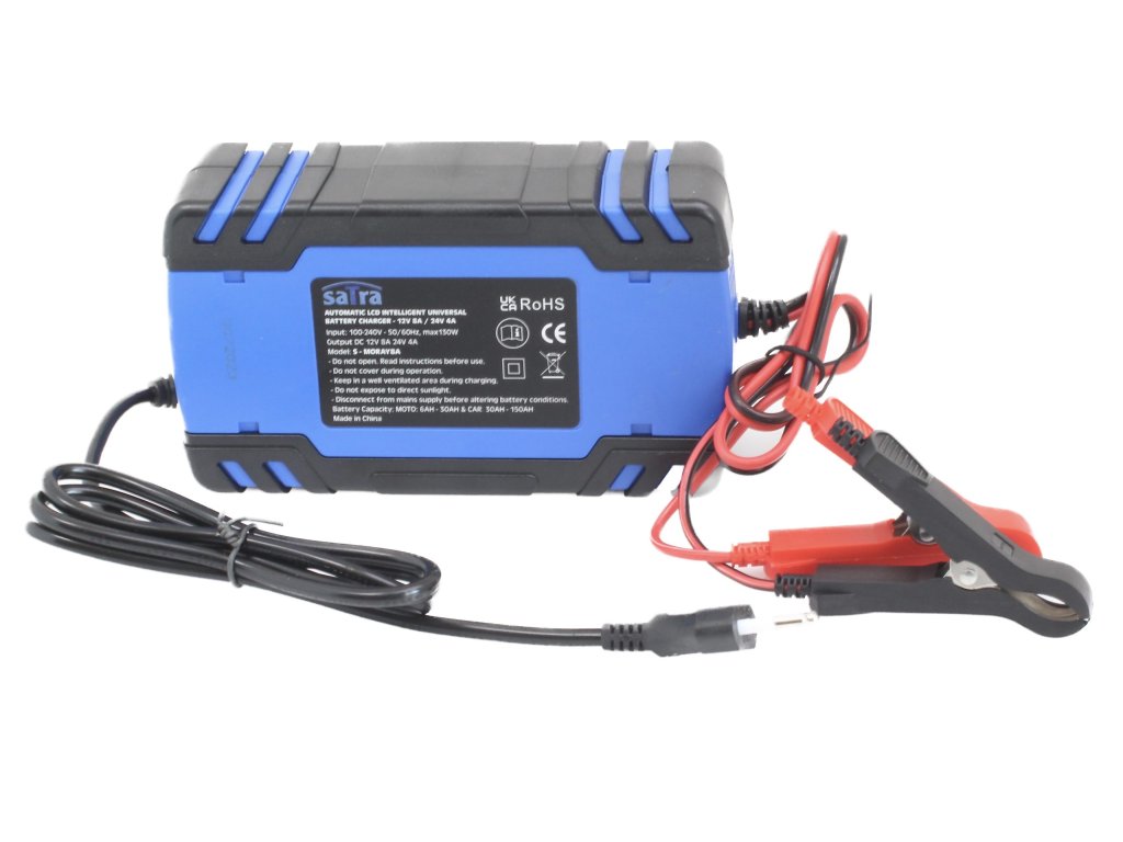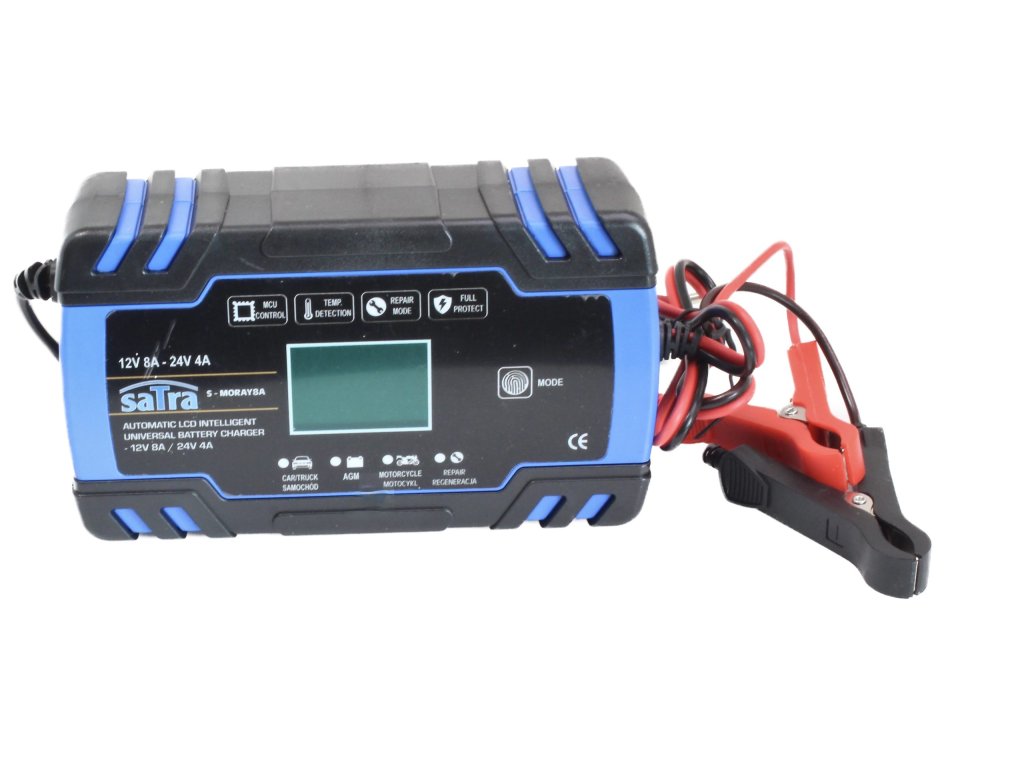 Plně automatická nabíječka s LCD displejem určená pro nabíjení autobaterií, motocyklů a dalších 12V/24V 8A/4A baterií – SATRA S-MORAY8A.