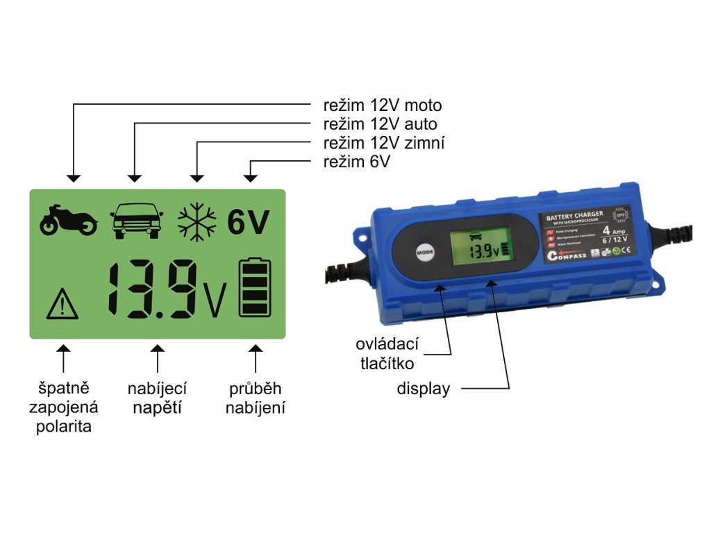 Nabíječka automaticky rozpozná, je-li připojen 6V nebo 12V akumulátor. Při zapojení 12V akumulátoru lze tlačítkem zvolit různé režimy nabíjení (režim šetrného nabíjení, standardní režim a zimní režim).