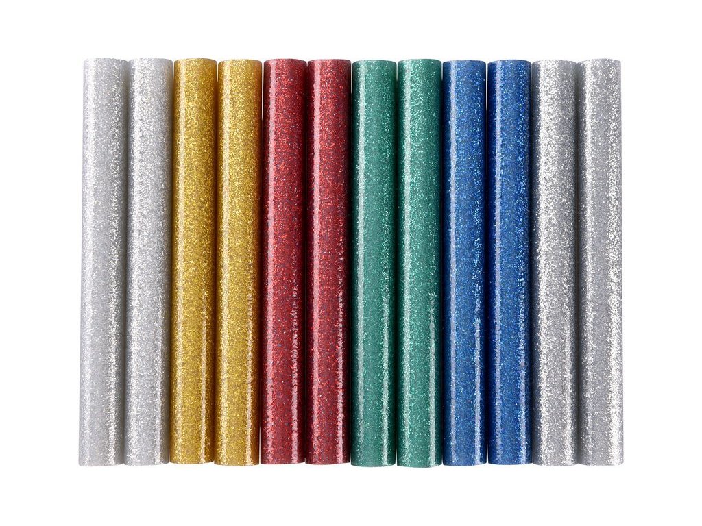 Tavné tyčinky pro lepicí pistole, průměr 11 mm, délka 100 mm, různé barvy s třpytivým efektem (tzv. glitter), sada 12 kusů – EXTOL CRAFT EX9911