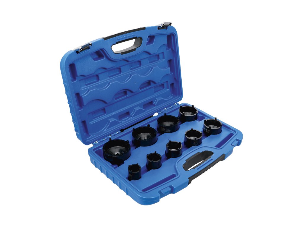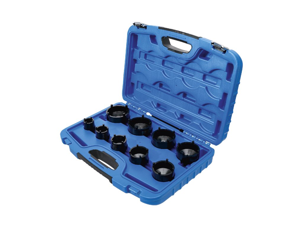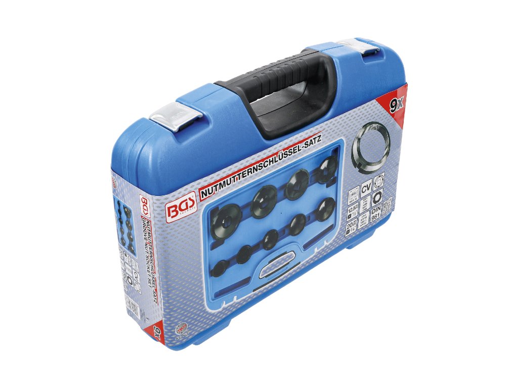 Nástrčné klíče – hlavice na hřídelové matice KM se zářezy, vodicí 4hrany 1/2“ a 3/4“, sada 9 kusů v plastovém kufru – BGS technic 8337