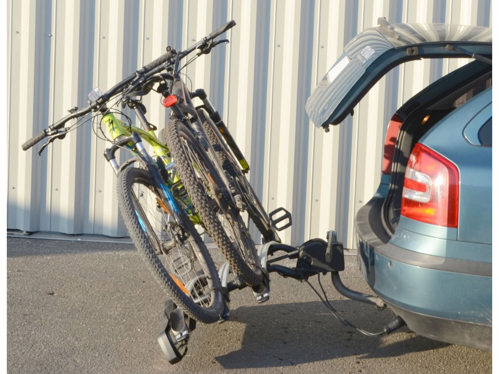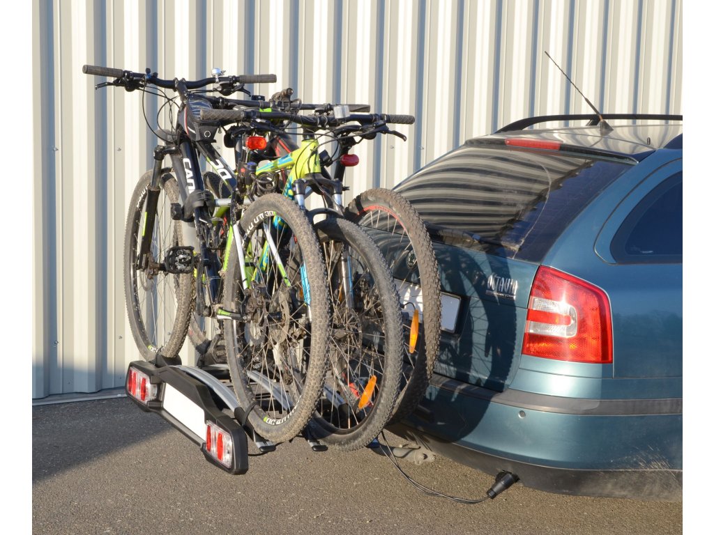 Univerzální nosič jízdních kol s jednoduchým systémem upevnění, sklápěním pro přístup do kufru, s kompletně osvětleným panelem a místem pro SPZ.