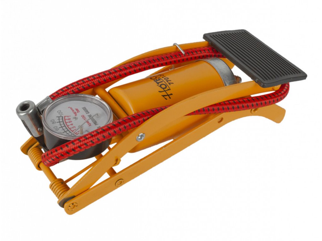 Kompaktní a jednoduchá pumpa pro huštění pneumatik na autě, motorce či jízdním kole, pro nafukování bazénů, matrací, balónů apod. Díky pedálu není třeba se při práci ohýbat, hadice je vybavena standardní koncovkou s pojistkou na autoventilek. Tlak lze sledovat na přehledném manometru.