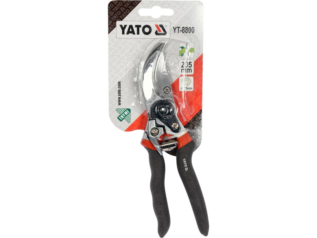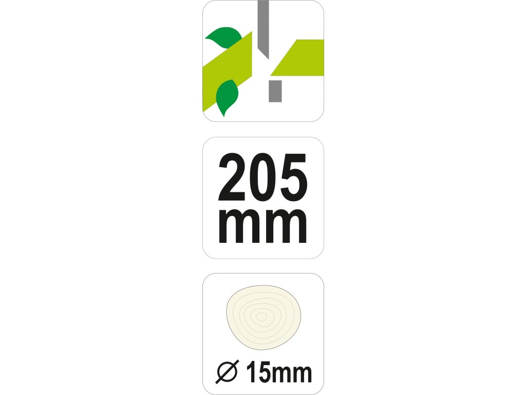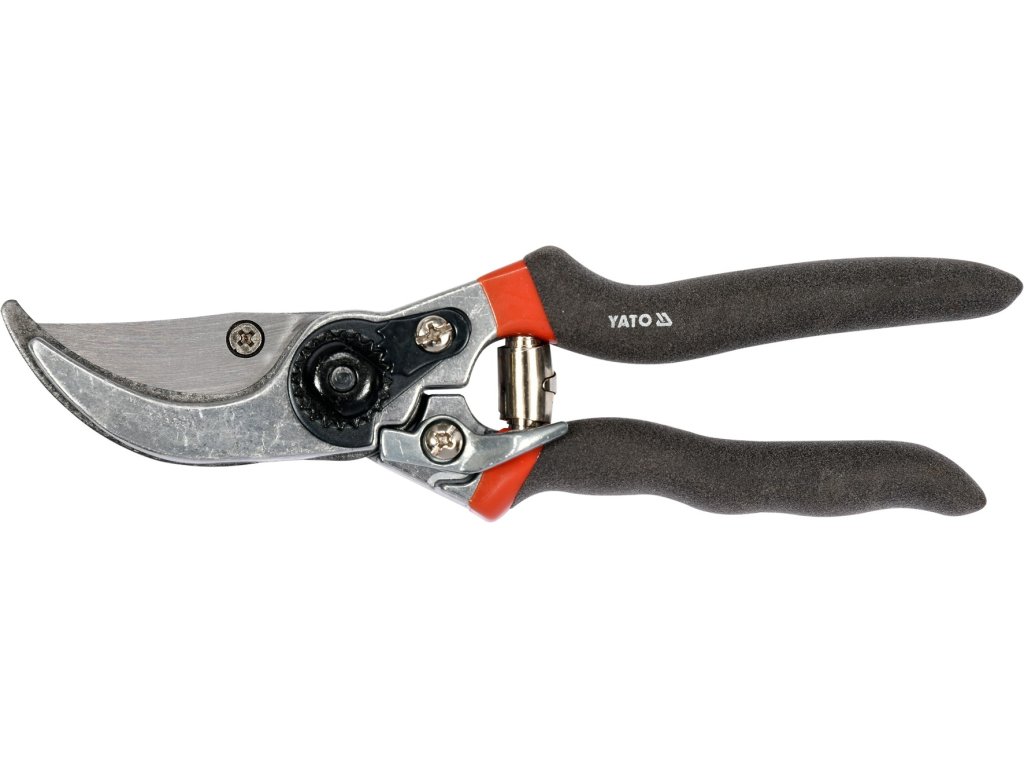 Ruční zahradní nůžky, čepel z karbonové ocely se šikmým střihem o celkové délce 205 mm průměru střihu do 15mm, určené ke střihu větví či jiného rostlinného materiálu s ergonomickou hliníkovou protiskluzovou rukojetí pro bezpečné držení.