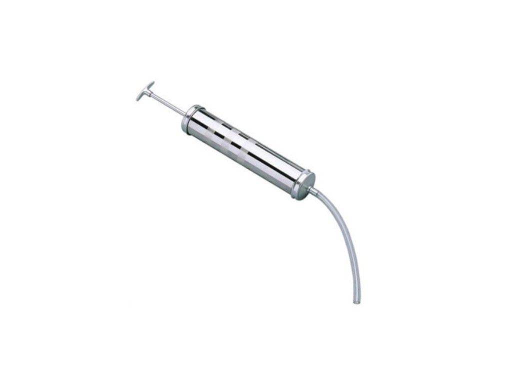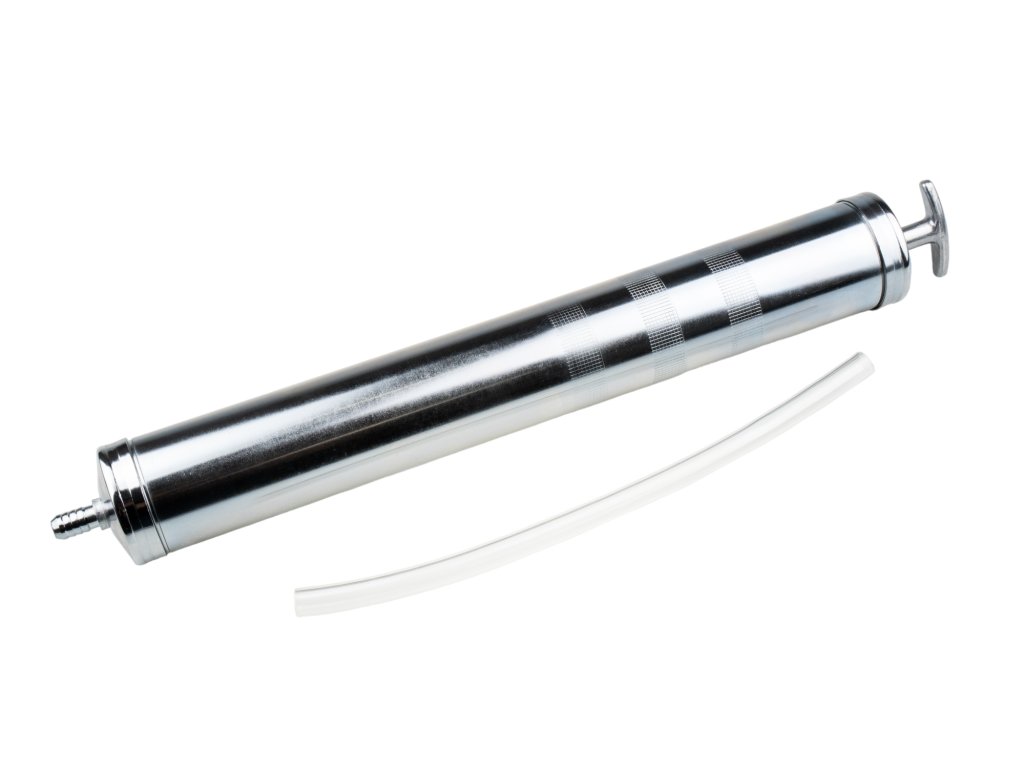 Manuální odsávačka a plnička olejů a jiných kapalin, objem 1 litr, s hadičkou, celokovová – QUATROS QS18004.