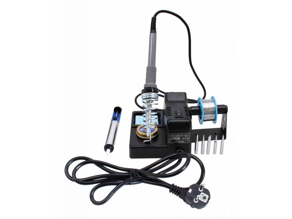 Dodáváno s pájecími hroty, kalafunou, cívkou s cínem a odsávačkou na cín.