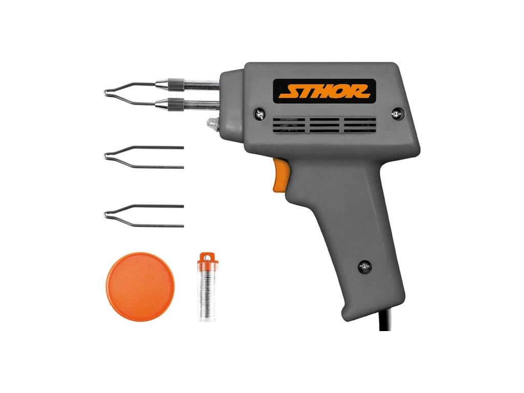 Pistolová transformátorová pájka Stohr 100 W v kufru pro všestranné použití v elektrotechnice a dílně. Klasické provedení se žárovkou na osvětlení pracovní plochy. Obsahuje pájecí pistoli, cín, pájecí pastu a náhradní hroty..