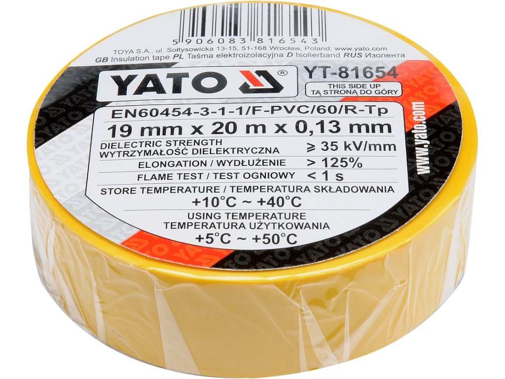 Páska odolává napětí do 4000V (EN60454). Páska žluté barvy s návinem 20 m, šíře 19 mm s tloušťkou 0,13 mm.