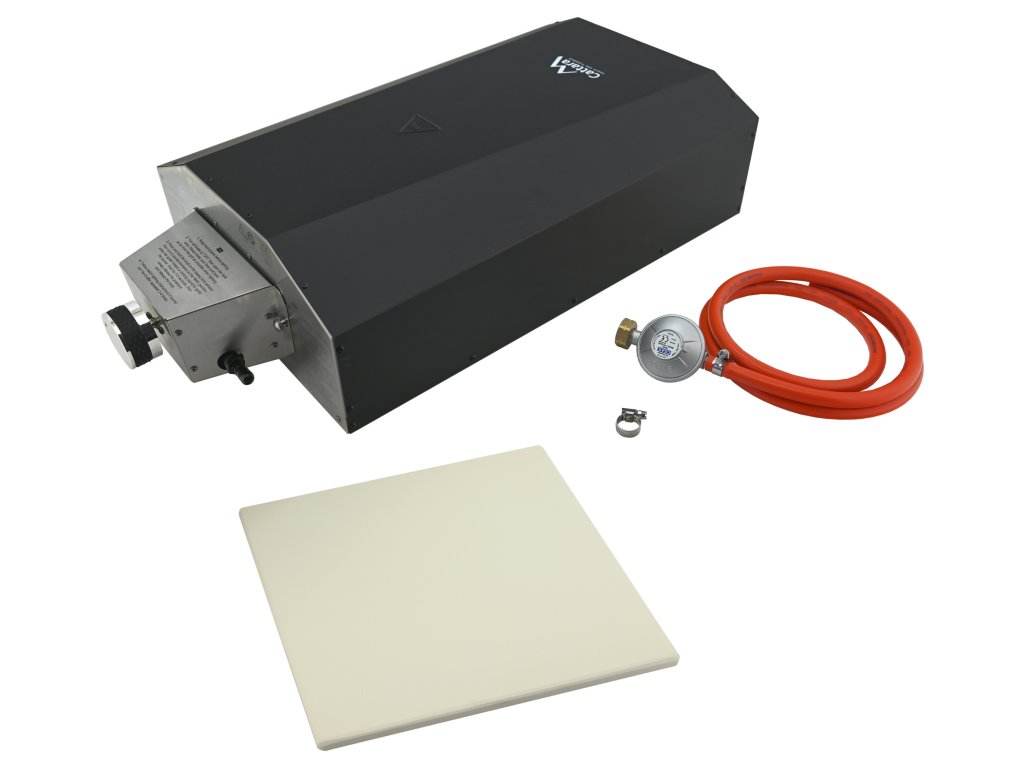 Pec je opatřena plynovým hořákem s vysokým výkonem pro koncentrované a rychlé rozehřátí. Hořák je doplněn piezo zapalováním pro snadné zažehnutí plamene s ovládáním na zadní straně pece. Ovladačem je rovněž možné plynule regulovat výkon.