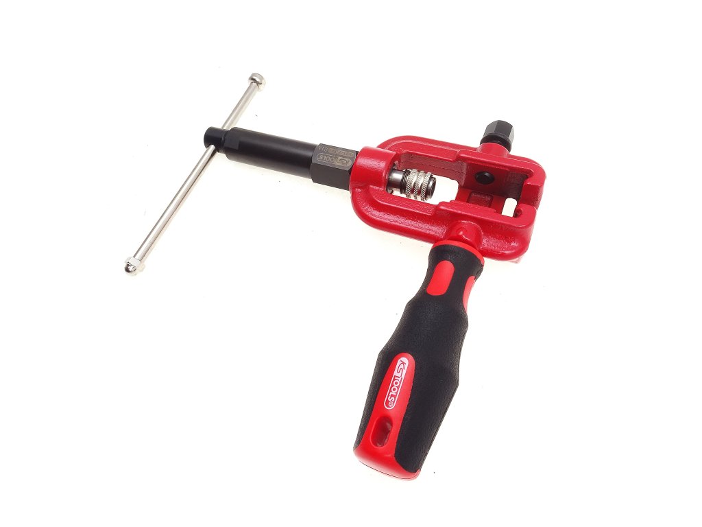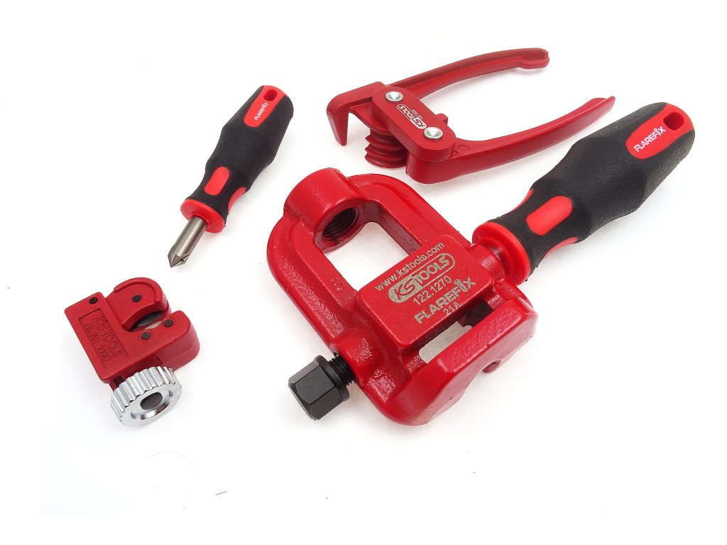 Pertlovací sada pro úpravu konců brzdových trubek, s řezačkou, ohýbačkou, čistícím nástrojem a adaptéry – KS TOOLS 122.1290