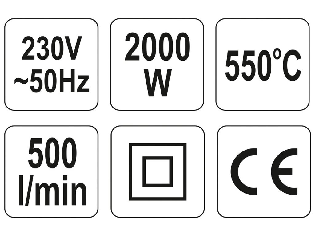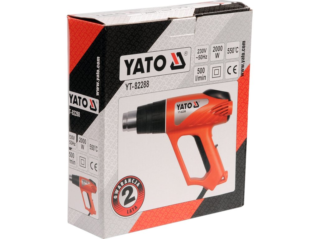Klasická kvalitní horkovzdušná pistole Yato s dvěmi stupni výkonu. Tato pistole nemá v příslušenství žádné dodatečné usměrňovací trysky proudu horkého vzduchu.