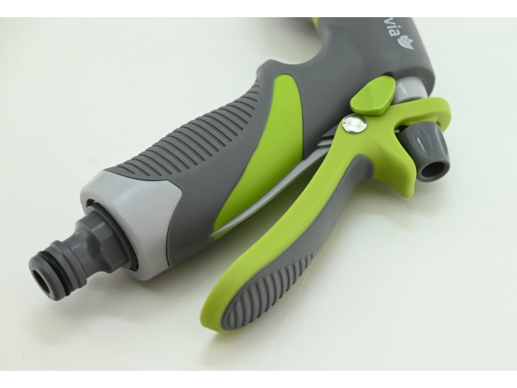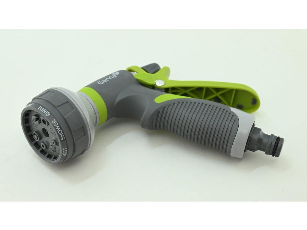 Sada obsahuje kruhovou zvlažovací pistoli s nastavitelnými režimy zavlažování otáčením čelní části (plný oplach, kuželový postřik, silný proud, středový postřik, vodní mlha, sprcha, smáčení, plochý postřik). Rukojeť je opatřena spouští, díky které lze individuálně dávkovat vodu, bez plýtvání. Zároveň je možné zajistit, použitím západky, nepřetržitý průtok. Průtok samotný lze regulovat otočným prvkem na spoušti. Pistole je opatřena CLICK adaptérem, který umožňuje rychlé připojení jednoduchým nacvaknutím k hadici opatřené CLICK rychlospojkou.