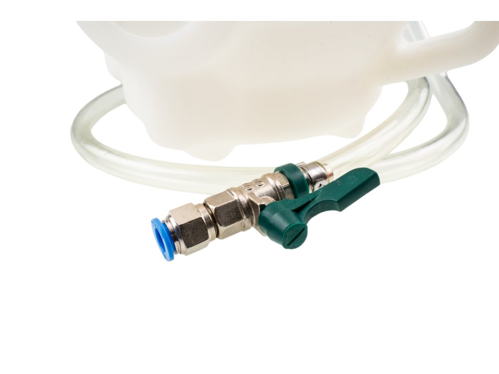 Průhledná silikonová hadice o délce 150 cm je zakončena ventilem pro spuštění a zastavení výdeje oleje s rychlospojkou pro snadné připojení různých ATF adaptérů (jsou součástí balení). Nádoba má rukojeť pro snadné přenášení.