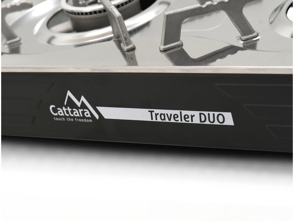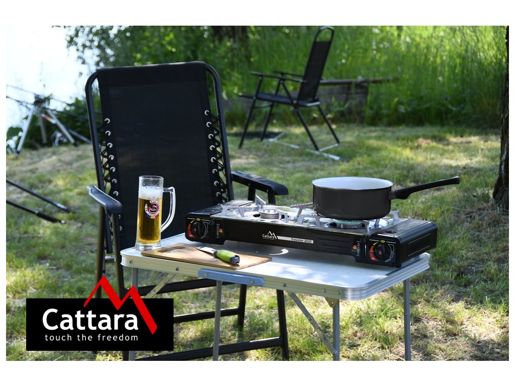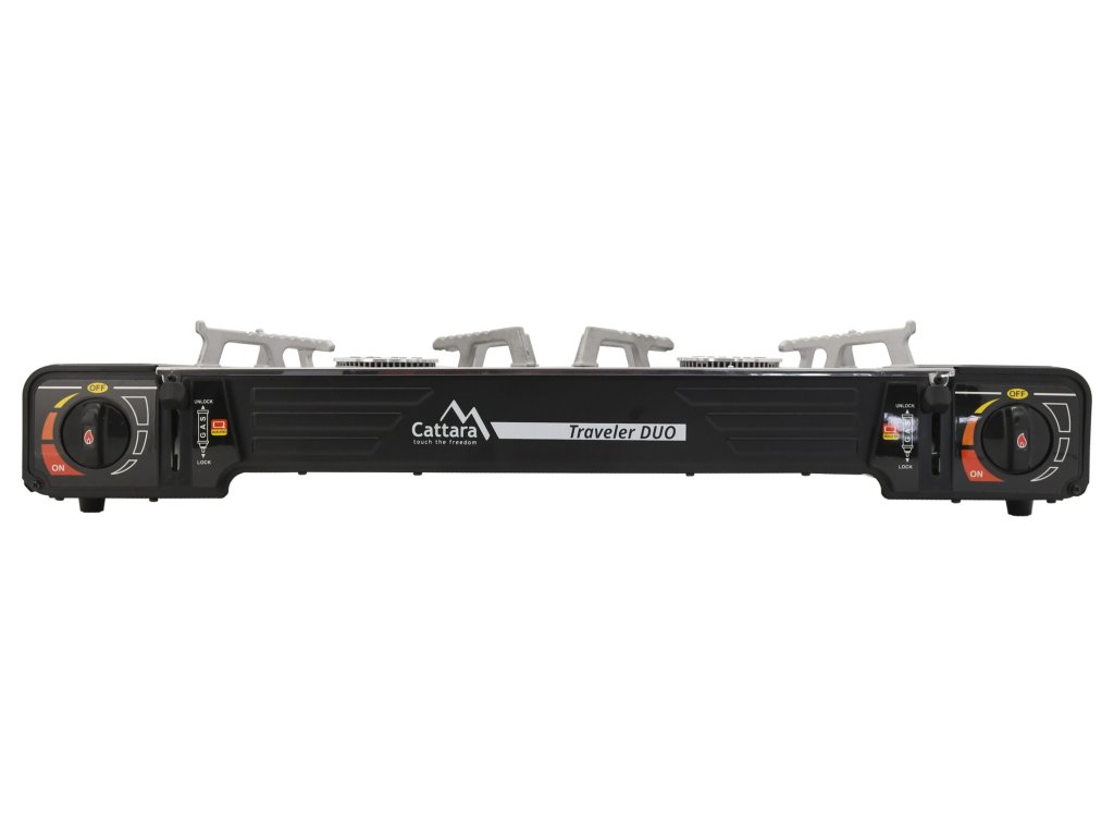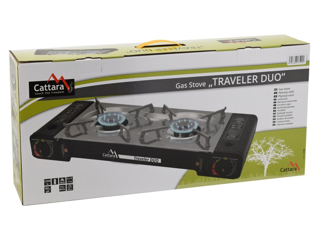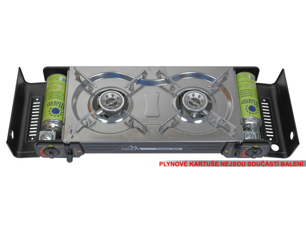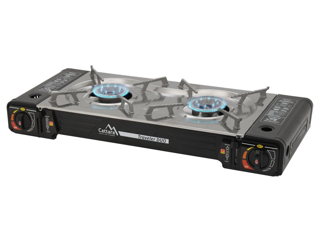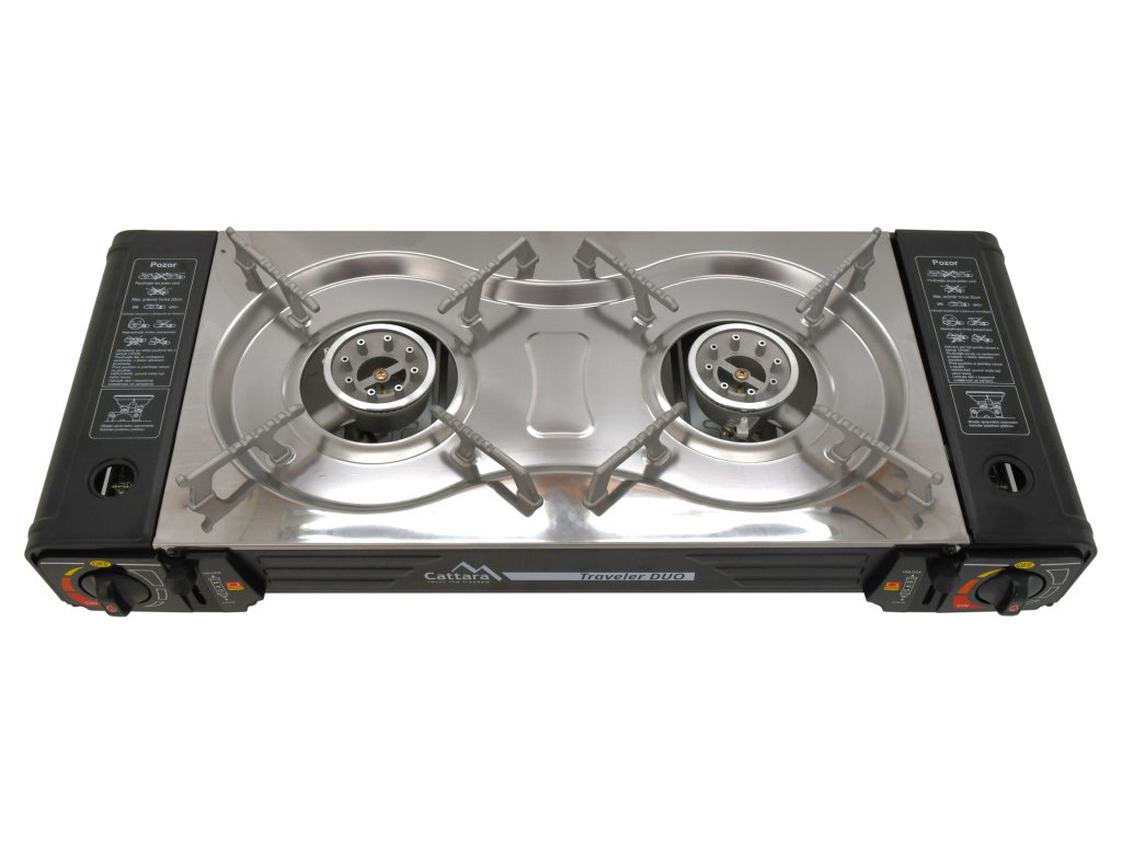 Outdoorový cestovní vařič se dvěma hořáky na propan-butan, pro ohřívání a přípravu pokrmů na cestách, v kempu apod.