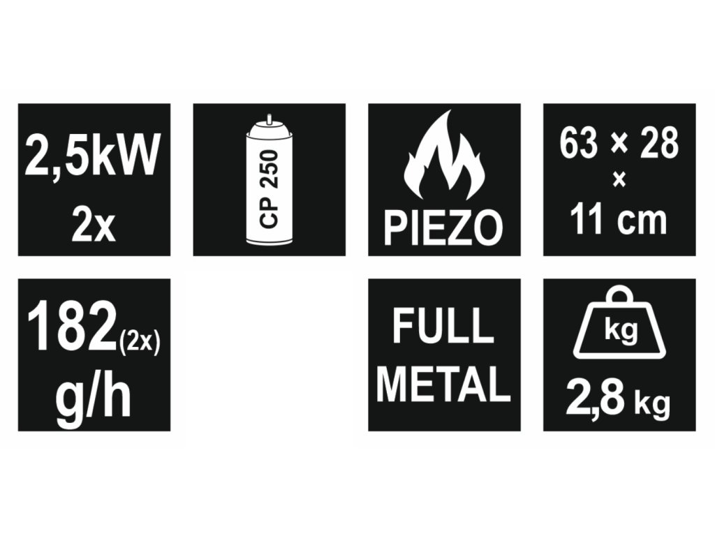 Vařič pro venkovní použití je opatřen dvěma prostory pro umístění kartuše CP250 (220g). Veškeré připojované plyny musí splňovat požadavky pro normu ČSN EN 417.